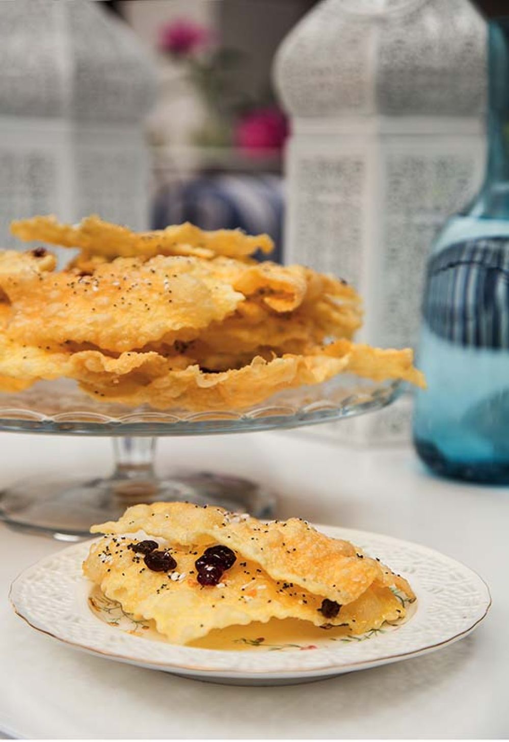 Osusz na papierowym ręczniku. Wodę z cukrem gotuj, aż uzyskasz gęsty syrop. Lekko ostudź. Dodaj miód. Układaj chrusty w stożek. Każdą warstwę polej syropem i posyp makiem, wiórkami i bakaliami.