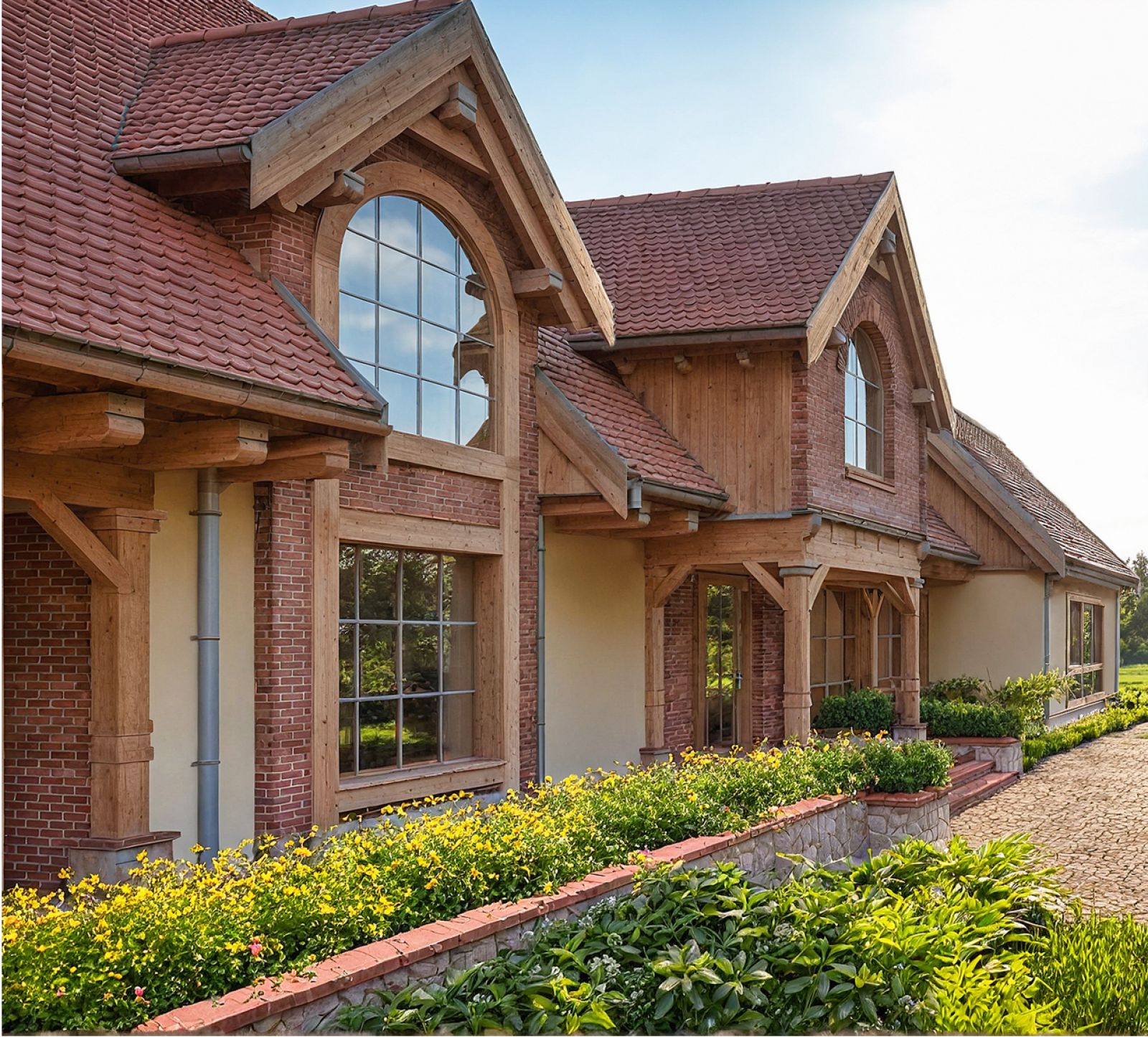 Harmonia z naturą oznacza dla nas współistnienie z przyrodą. To architektura, która szanuje krajobraz, proporcje i lokalne materiały. Cegła, drewno, kamień, trzcina jako pokrycie dachowe, wybieramy je nie z sentymentu, ale dlatego, że są trwałe, autentyczne i z biegiem czasu nabierają szlachetności. Starzeją się razem z Domem i jego mieszkańcami, a nie przeciwko nim.