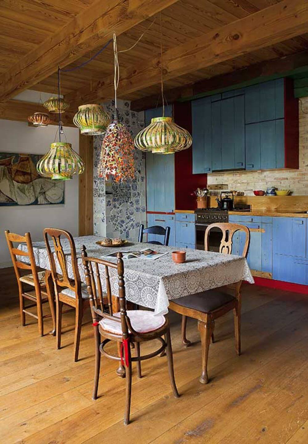 Dostała szafkę nocną do sypialni i drewniany kufer na drewno przy kominku w salonie. – Myślę, że takie meble świetnie pasują do prostych przedmiotów z odzysku – mówi artystka. – Wnętrza urządzone wyłącznie antykami czy meblami z Ikei nudzą mnie. Dlatego na przykład w salonie położyłam perski dywan, a nad nim zawiesiłam pomarańczowe ryby dyndające na długiej gałęzi. A wiecie, z czego są zasłony? Uszyłam je z kraciastych obrusów! Mój dom to tak naprawdę duży patchwork. Przypomina moje prace.