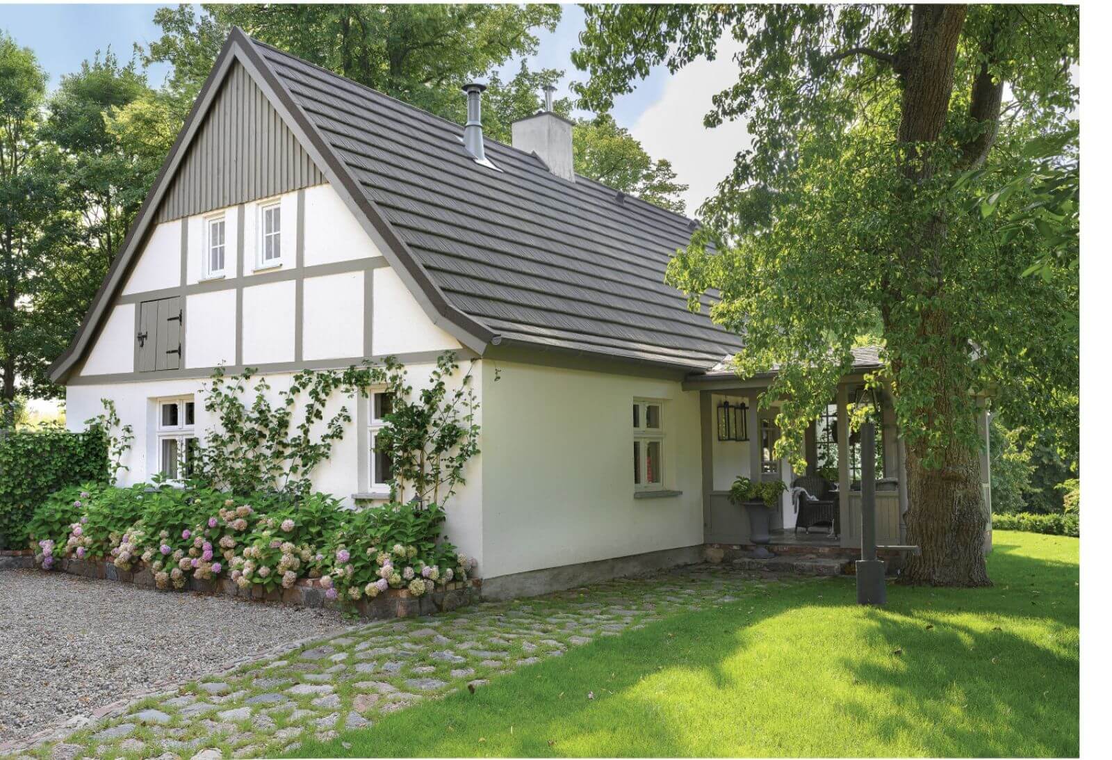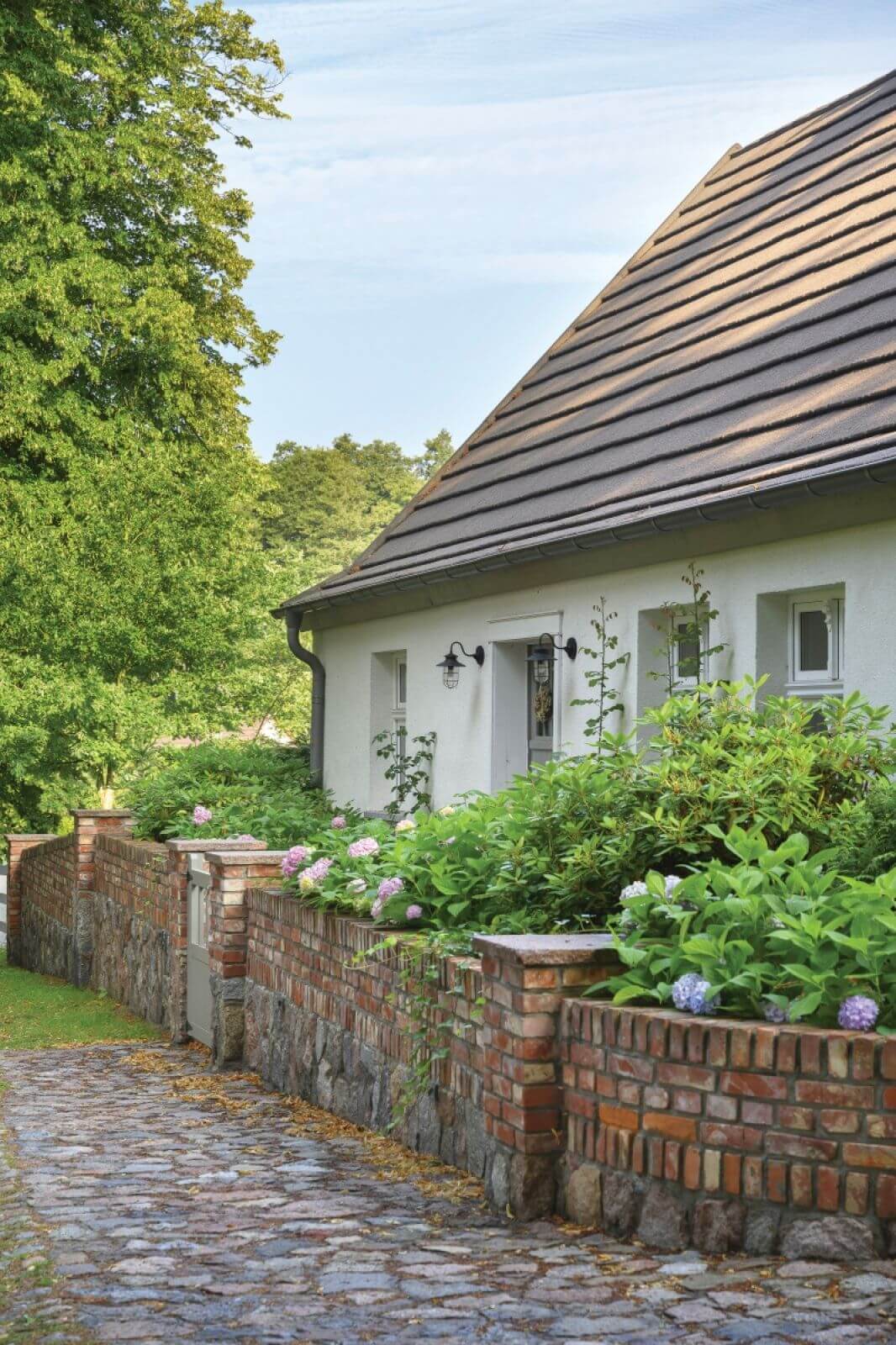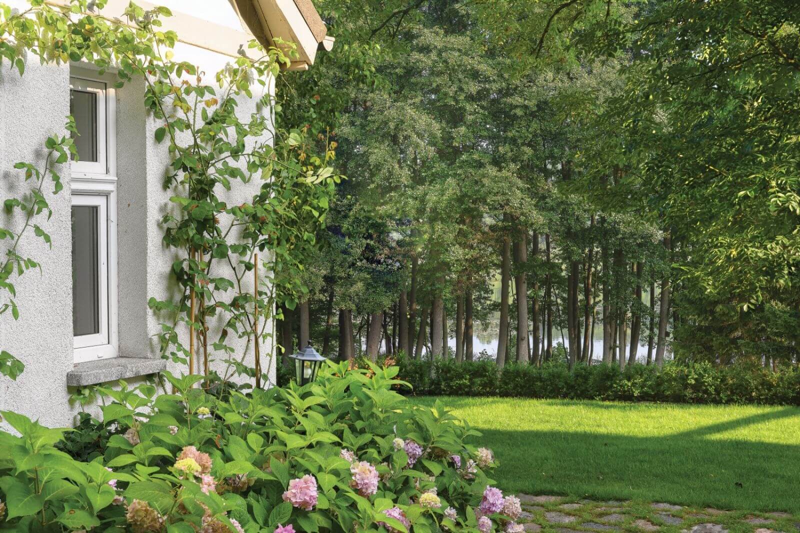 Dom stoi na skarpie z widokiem na jezioro, na działce o powierzchni 2 tysięcy metrów kwadratowych. W otaczającym go ogrodzie Damian posadził różowe hortensje ogrodowe ‘Endless Summer’, które kwitną niezawodnie każdego roku i nie boją się wiosennych przymrozków. Do tego angielskie róże pnące ‘Constance Spry’ i rododendrony. Są również skrzynie z ziołami i warzywami. Ozdobą obejścia jest grusza ulęgałka, którą uwielbiają szpaki i wiewiórki, a Damian żartuje, że to także jego największe utrapienie. Gruszki co dwa lata bombardują dach i ludzi, a potem trzeba je wywozić całymi taczkami.