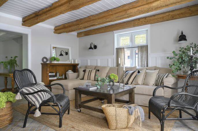 We wnętrzu prym wiedzie styl hamptons, z domieszką angielskiego cottage i amerykańskiego farmhouse. Królują naturalne materiały i kolory. Jasne ściany, drewniane belki sufitowe, jutowe dywany, lampy z rattanowymi abażurami i lniane tkaniny w odcieniach beżu i szarości. Na podłodze trawertyn w jodełkę z ciemną, centymetrową fugą sprawia wrażenie starej ceglanej posadzki. Na poddaszu konstrukcja dachu została odsłonięta, docieplona, pokryta białymi deskami i uszczelniona jutowym sznurkiem.