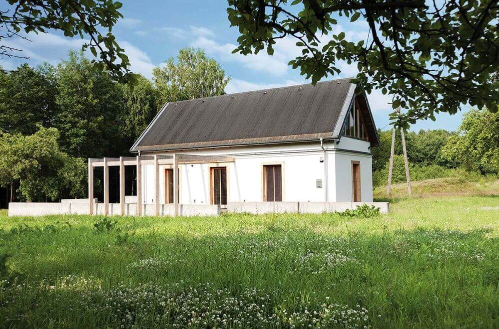 Z dawnego siedliska zostało tylko kilka ścian. Wewnątrz widać jeszcze odsłoniętą oryginalną cegłę. Maciek jest architektem, więc dom i wystrój zaprojektował sam. Najpierw pozbył się budynków gospodarczych – tradycyjnie zamykały podwórze do wewnątrz. W ten sposób otworzył dom na las i ogród.