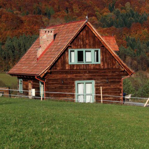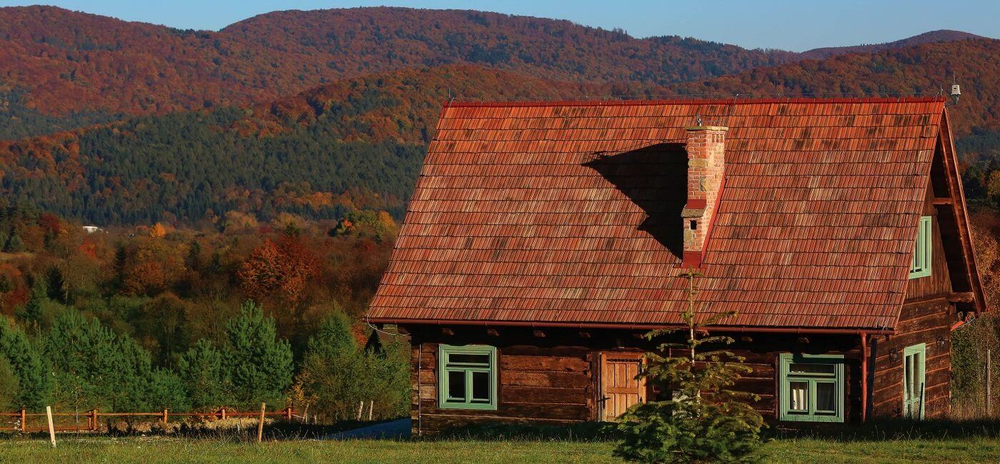 Beskid Niski: drewniany dom z miętowymi oknami i łemkowskim akcentem