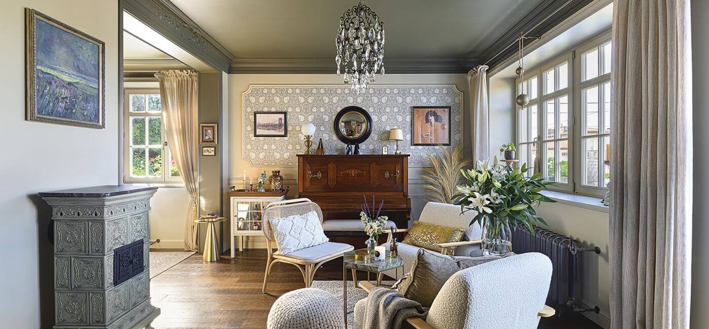 Wiedziała, że właśnie takie przytulne, pełne mebli, tkanin i sztukaterii miejsce jest jej marzeniem. Ze skandynawskim minimalizmem to było mgnienie, moment fascynacji tym, co nowe. Oboje z mężem Krzyśkiem prowadzą pracownię architektury wnętrz, są więc wyczuleni na wszelkie pojawiające się trendy. Chcieli kupić dom w Krośnie, niedaleko rodziców, w najładniejszej (i najbardziej rozchwytywanej) dzielnicy miasta – na wzgórzu nad Wisłokiem.