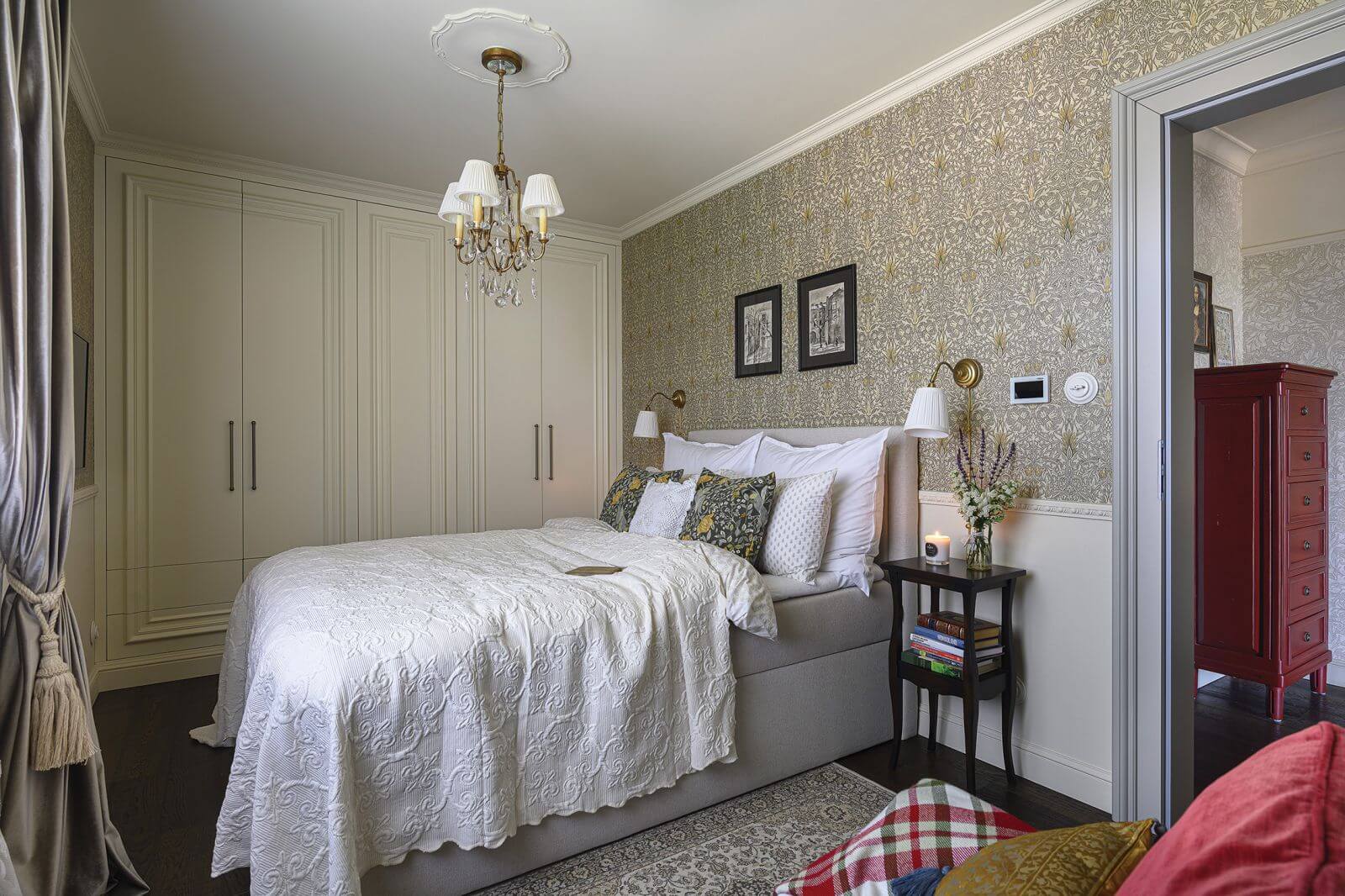 W sypialni, która miała być lekka, jasna i przytulna, użyła drobnego, koronkowego wzoru w starym złocie i perłowym beżu. Najbardziej odważne połączenie kolorów znajdziemy w łazience, gdzie zieleń łączy się z bordo, tworząc ciemny, gabinetowy nastrój. Ważnym elementem stylizacji są sztukaterie. Miały nawiązywać do tapet, czasami nawet powtarzając pewne motywy. W każdym pomieszczeniu są inne, te w salonie i jadalni mają kwiatowy wzór. Nawet zabudowa kuchenna zaprojektowana przez architektkę jest ozdobiona sztukaterią, co stanowiło źródło strapienia dla stolarza. Całości dopełnia dębowa deska na podłodze i drewniane meble, w większości amerykańskiej marki Bramble & Co. Jak w prawdziwym wiktoriańskim domu jest tu pianino. Gra na nim Krzysiek, bo muzyka to jego pasja, urządził sobie nawet studio nagraniowe.