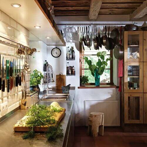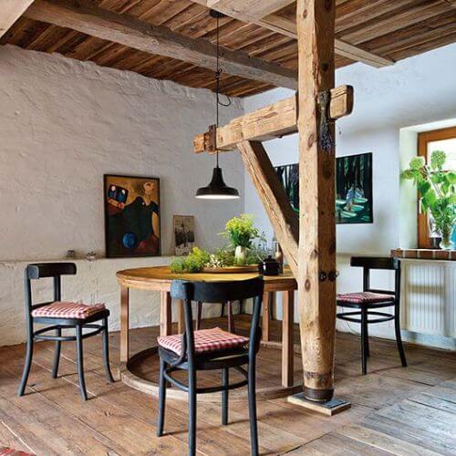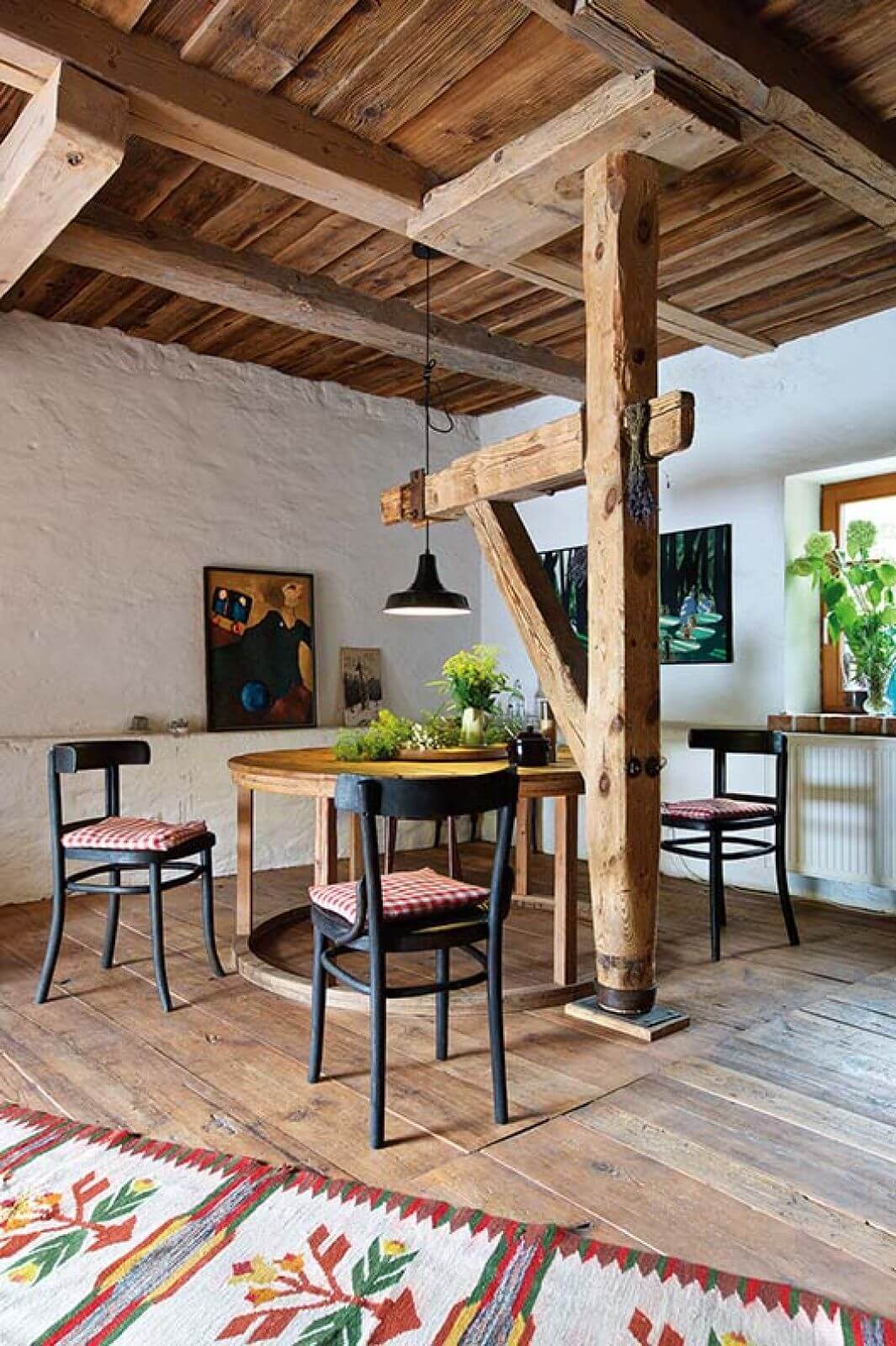 Stół na parterze zrobiony jest z kolei z okrągłych osłon na żarna, a nad nim widać lampę zawieszoną na starym drewnianym dźwigu.
