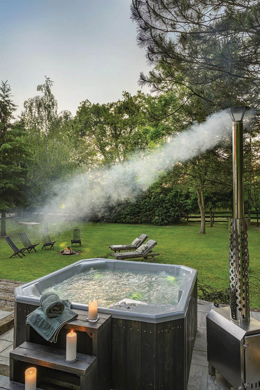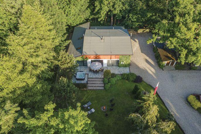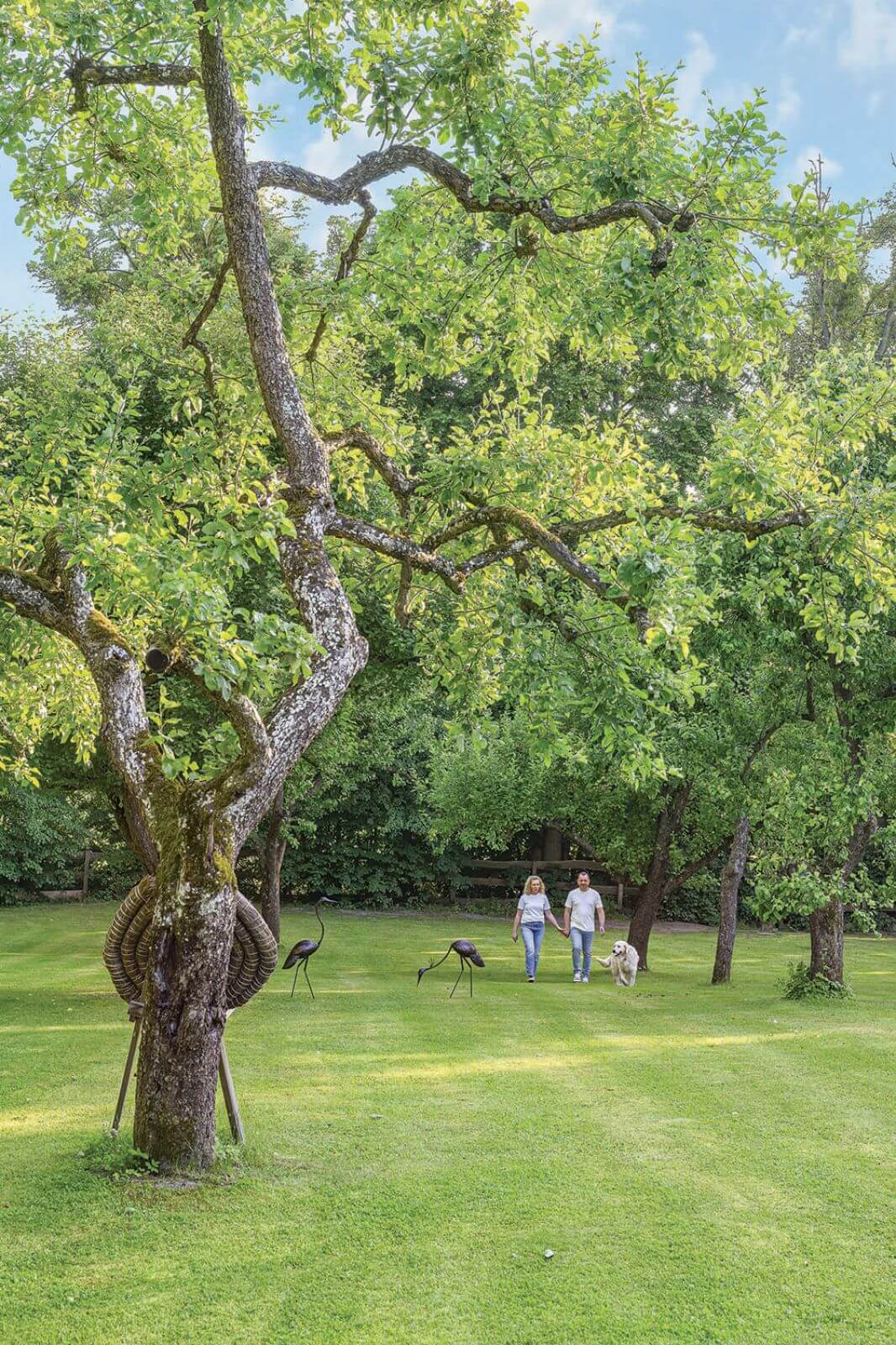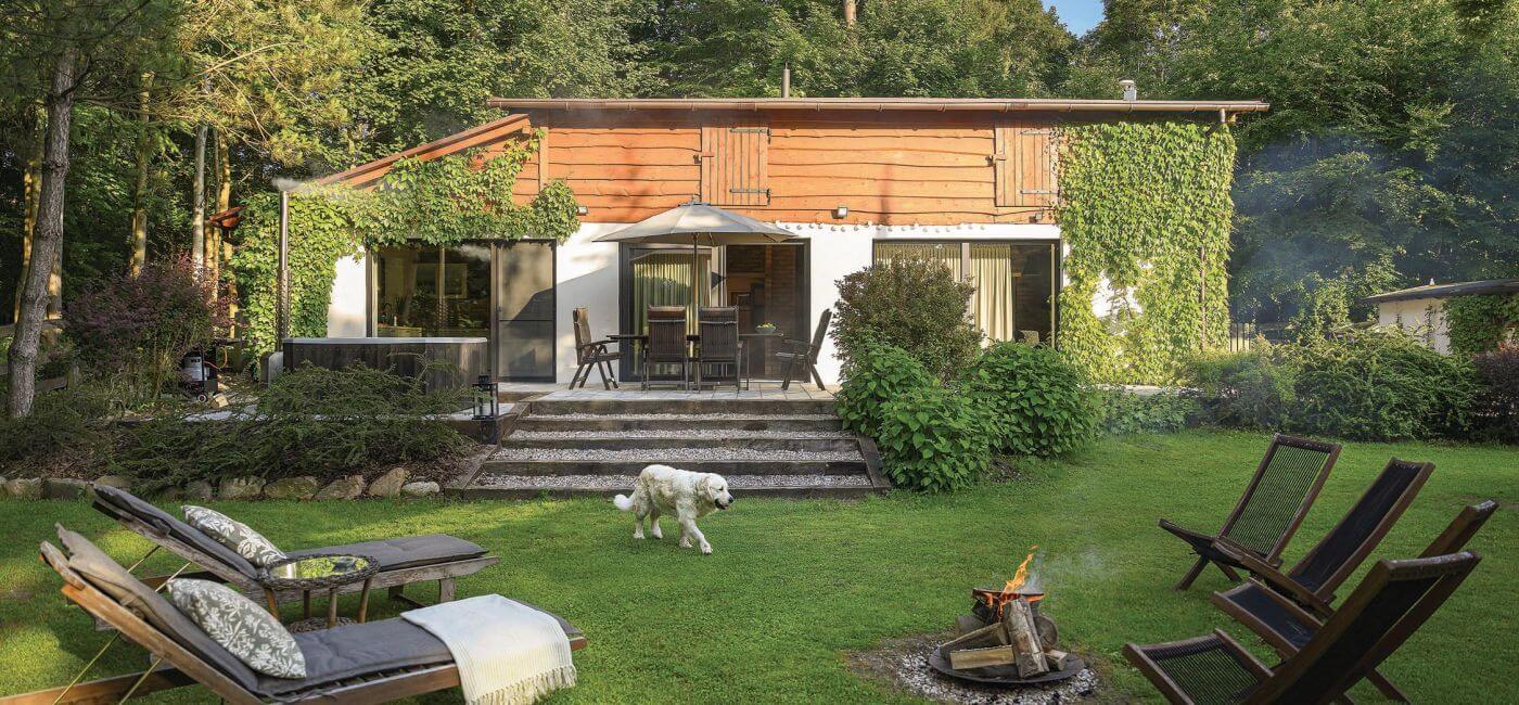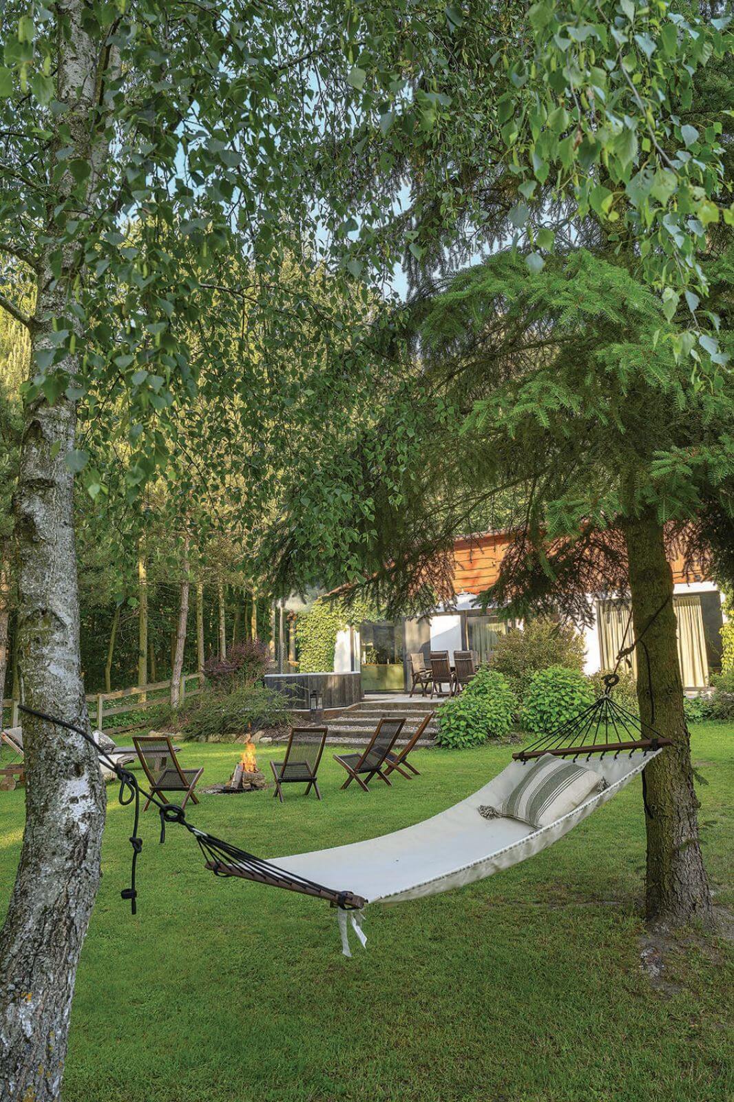 Na wielkiej działce zagospodarowali ogród w stylu angielskim – swobodny i naturalny, żeby pięknie komponował się z otaczającym lasem i sadem. Ogrodnictwo to pasja Piotra – który potrafi się zatracić przy koszeniu trawy, a zajęć przy roślinach nie brakuje. Pomaga mu Kasia – każdej zimy przycinają razem odrosty jabłoniom, tzw. wilki, by późnym latem obrodziły owocami. Niedawno odratowali wielki klon zaatakowany przez jemiołę. – Wywieźliśmy jej dwie przyczepy, spisałem już drzewo na straty i w myślach budowałem klonową konstrukcję pod glicynię, a on odżył – żartuje gospodarz. Przyroda jest nieprzewidywalna. Mogą się o tym przekonać goście Kasi i Piotra. Chociaż mają tu mnóstwo atrakcji (boisko do piłki nożnej, jacuzzi, trawnik do golfa), właściciele namawiają ich, by doświadczali natury wszystkimi zmysłami. Tu dzień budzą opadające nad pobliskie jezioro mgły, z ciszą konkuruje tylko stukanie dzięcioła i śpiew ptaków, dzikie zwierzęta podchodzą pod sam dom, a do środka przenika cudowny zapach lasu.