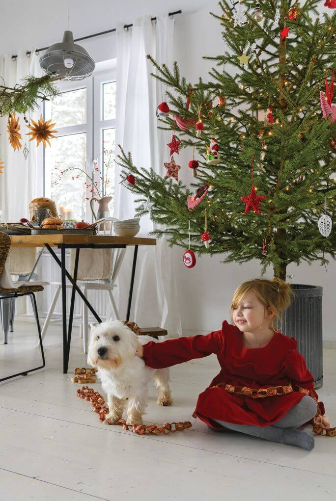 A w zeszłym roku, kiedy nie mogliśmy z powodu pandemii spędzać świąt wszyscy razem, wymyśliłam, że przez cały adwent codziennie będziemy robić nową ozdobę świąteczną – łańcuchy, gwiazdy, pierniczki do powieszenia na choince. Jakoś tak się stało, że wyszło nam drzewko w stylu mocno skandynawskim.