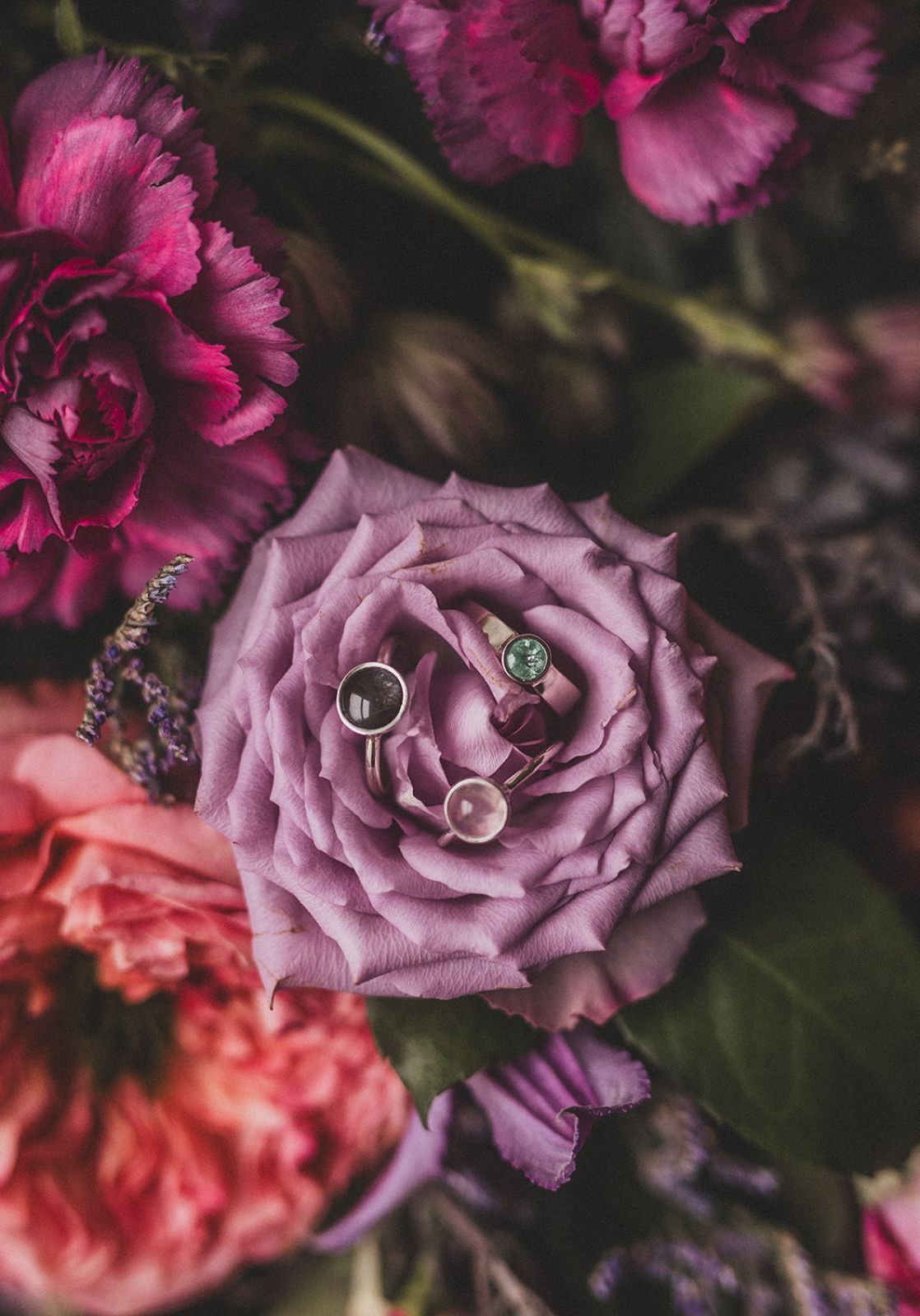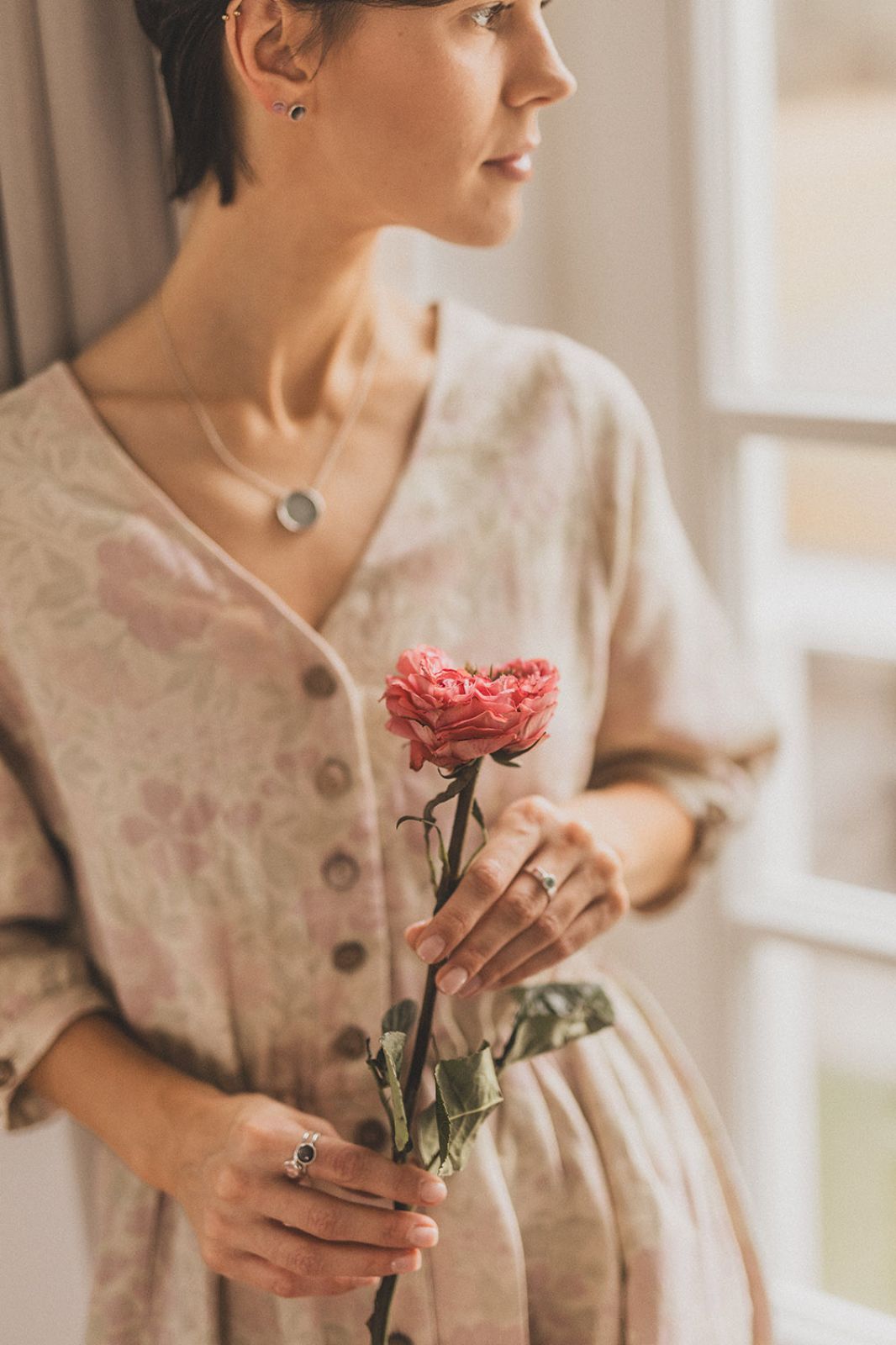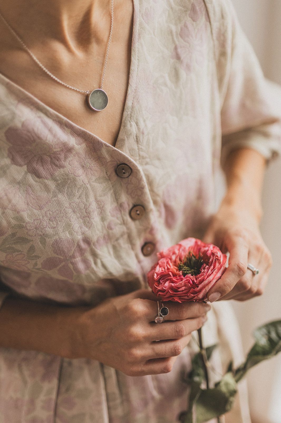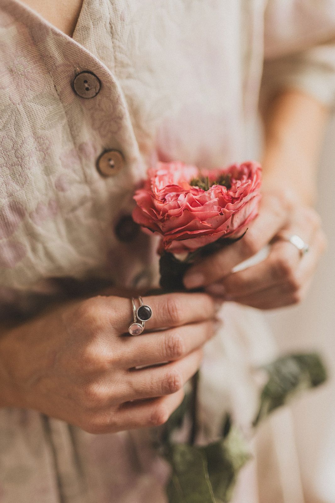 Dłonie trzymające kwiaty i biżuterię jak drobny, osobisty rytuał.
