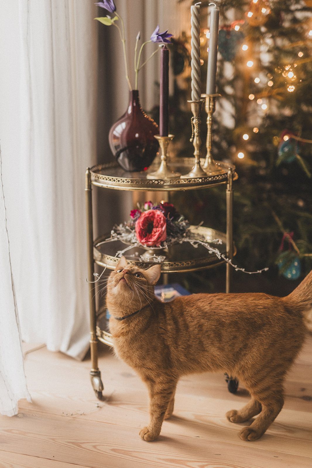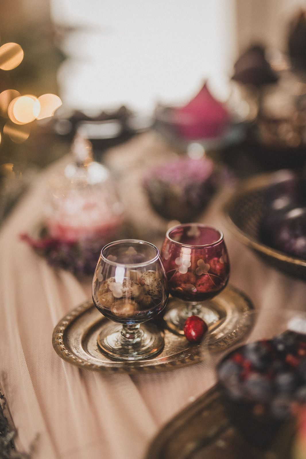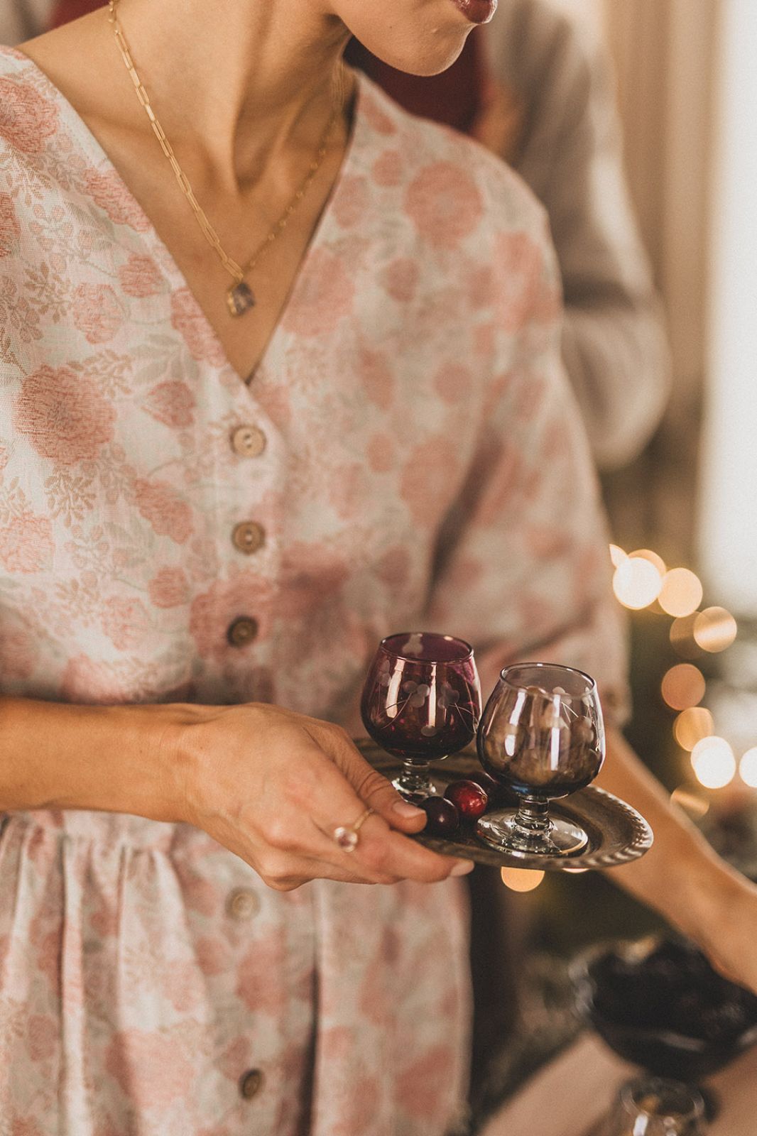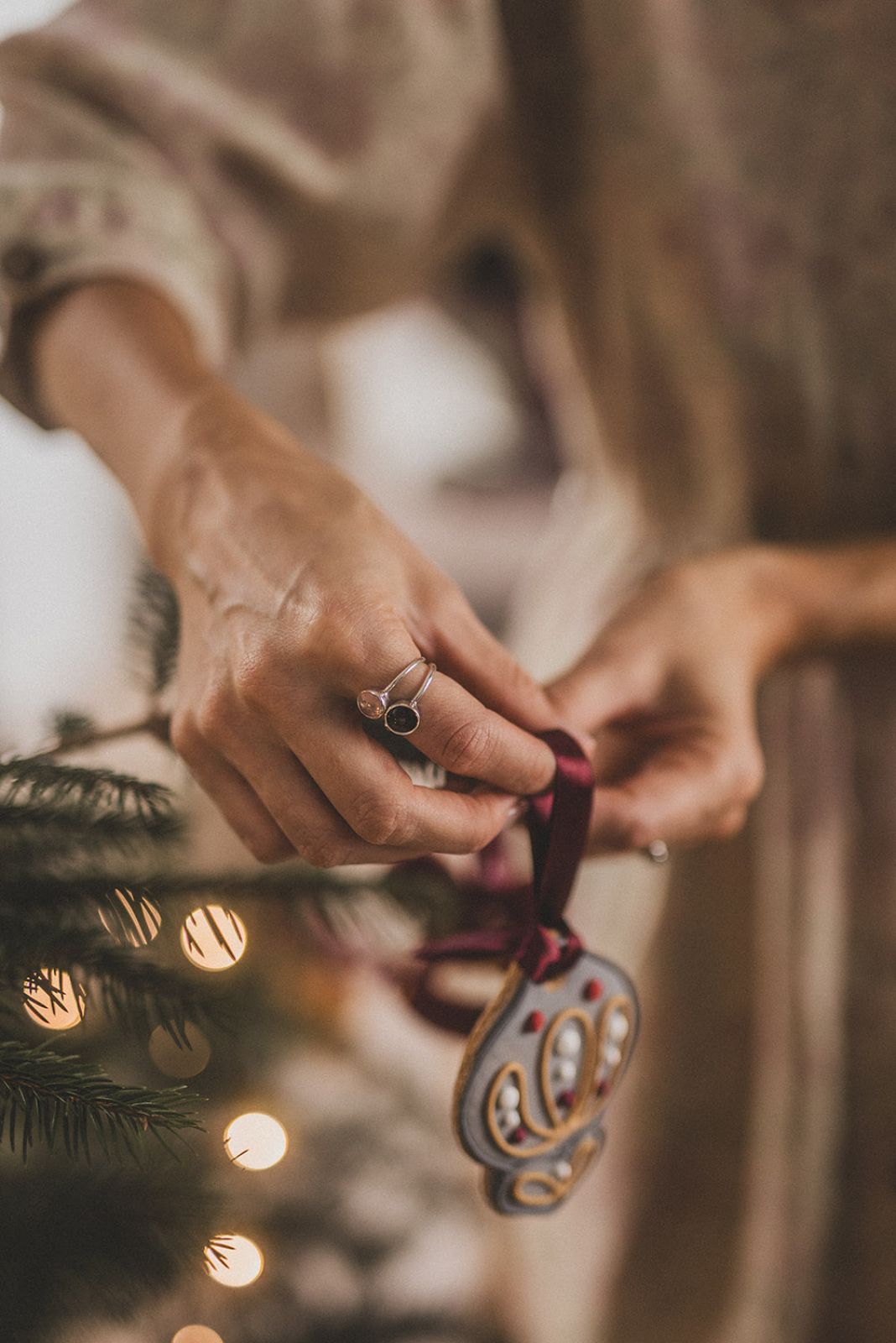 W świątecznym wnętrzu estetyka i natura przenikają się w najbardziej zaskakujących miejscach. Miseczka pełna jeżyn staje się tłem dla minimalistycznych pierścionków, a migotliwe światła choinki nadają im niemal baśniowy charakter.