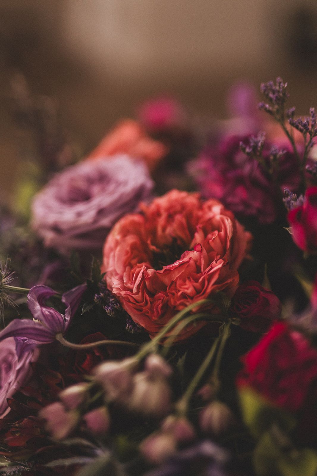 Obok łóżka, w starym metalowym naczyniu, stoi bukiet - intensywny, pełen czerwieni, fioletów, róż.