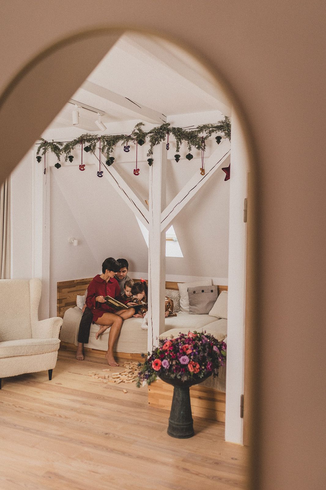 Najpiękniejsza dekoracja? Ta, której nie kupisz. Rodzina siedząca na łóżku, czytająca książkę pod wiszącą zieloną girlandą.