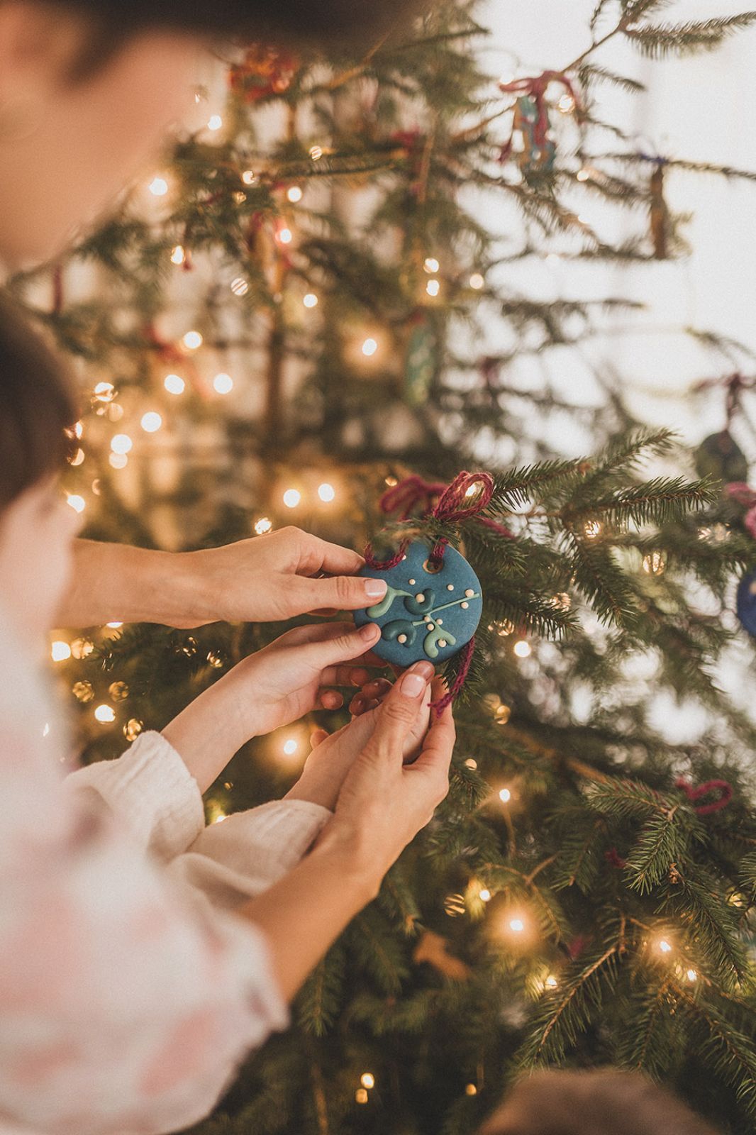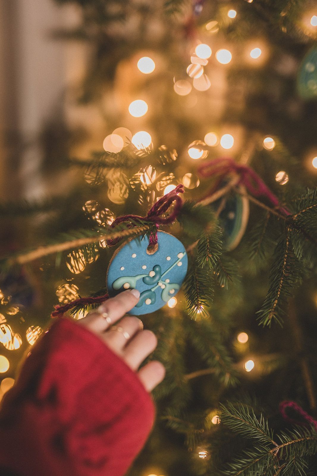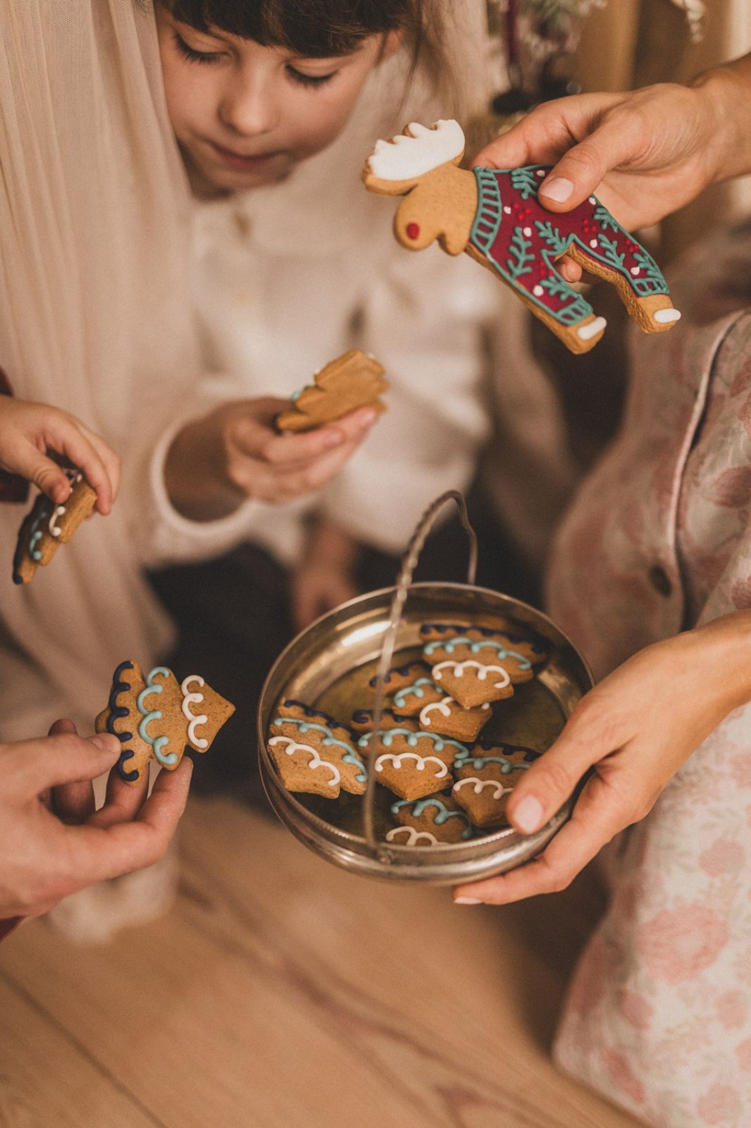Najpiękniejszy moment zawsze przychodzi później: małe dłonie pomagają dorosłym zawieszać piernikowe ozdoby na gałązkach świerku.