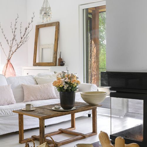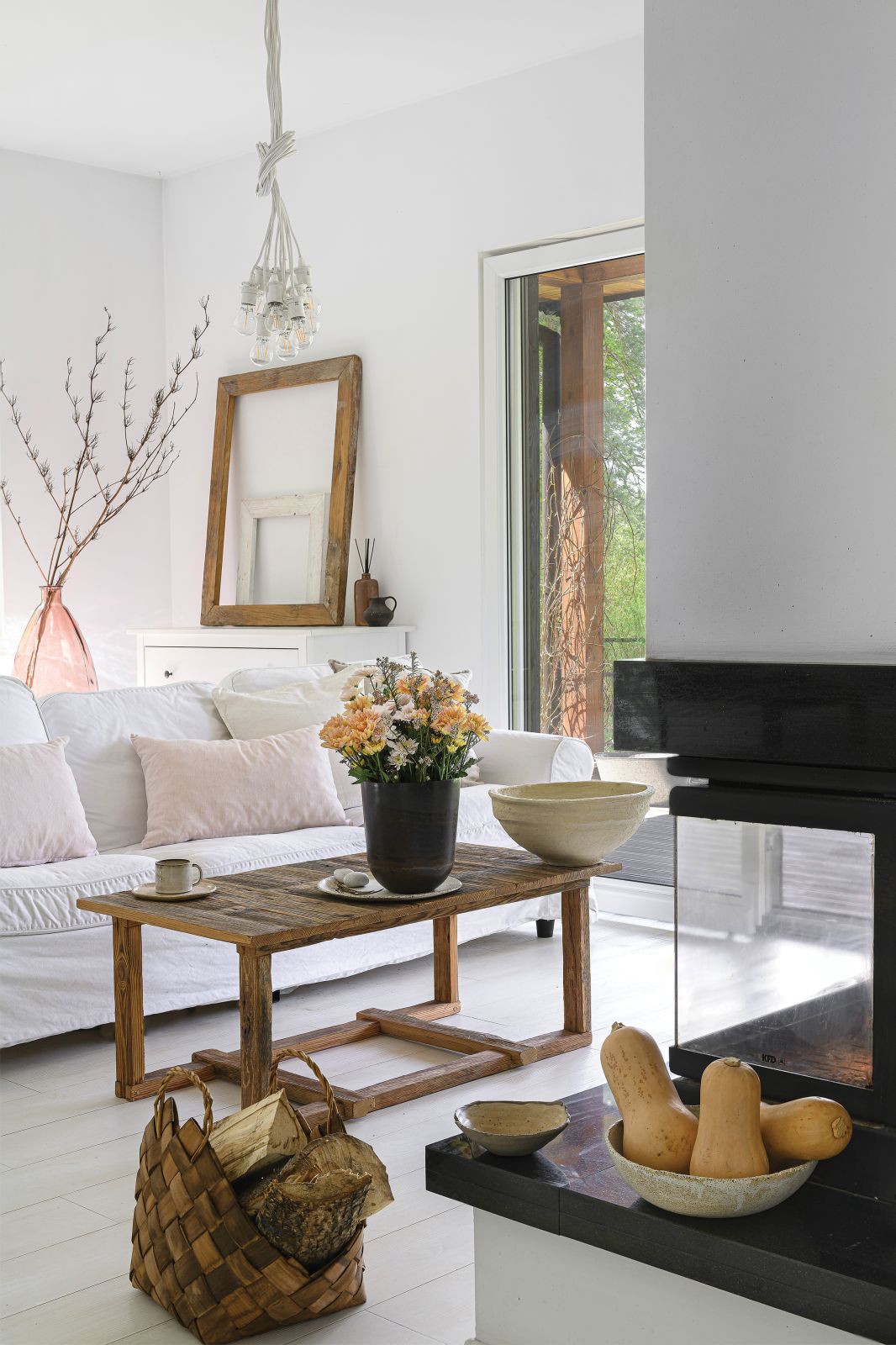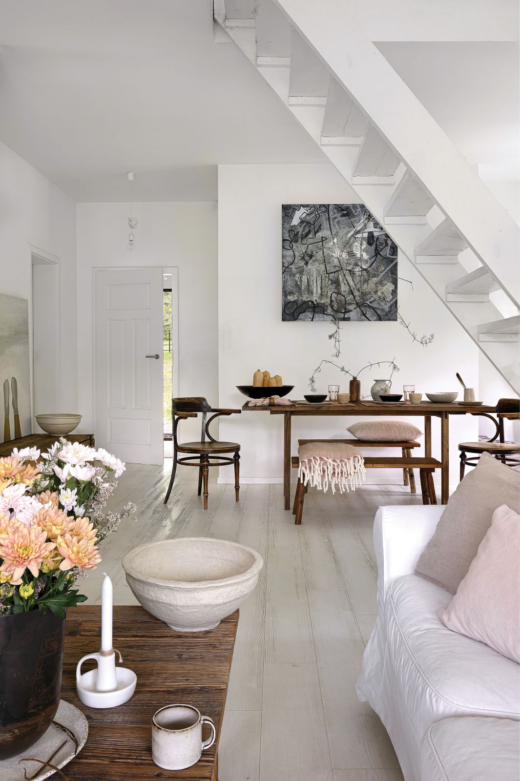 Przeprowadzki na wieś nie mogli się doczekać. Arek mieszkał kilka lat w Warszawie, a Iwona w Stanach. Obydwoje przekonali się, że duże miasta nie są dla nich. Chcieli żyć w zgodzie z naturą, trochę w odizolowaniu. Remont nie był trudny. Pierwotny projekt przerobił już poprzedni właściciel i otworzył przestrzeń. Oni wykończyli dół, czyli salon z kuchnią, sypialnię i łazienkę. Postanowili wprowadzić się i dopracowywać szczegóły. Pomysł na urządzenie wnętrz był prosty, postawili na styl skandynawski z ogromem bieli i drewnianymi elementami. – Lubię starocie, rzeczy niedoskonałe. Dlatego lampy są z początku wieku, mam thonety z 1895 roku. Rattanowe siedziska musiały się zniszczyć, więc zastąpiono je sklejką – tłumaczy Iwona. – Meble na zamówienie są zrobione w większości ze starych desek. Popatrz na stolik kawowy albo stół i ławy. Lubię też wszelkiego rodzaju przeróbki. Komoda w salonie jest z IKEA, ale zmieniłam jej nóżki i fronty. Lustro zrobiliśmy z ościeżnic kupionych na Podhalu – wylicza.