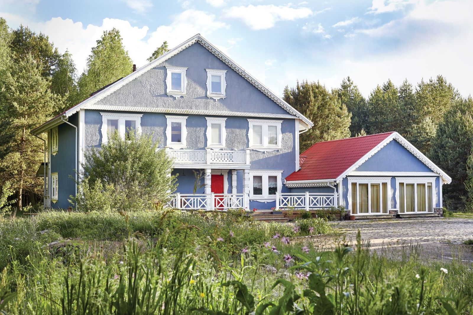 Elewacja do niedawna miała kolor bezchmurnego nieba, jednak czas i słońce zrobiły swoje. Nieco wypłowiała, teraz w zależności od światła zdaje się być to szarawa, to niebieska. Andrzej, zafascynowany Dworkiem Gubernatora Grodzieńskiego w Białowieży, przyozdobił ją w carsko-szwajcarskim stylu. Sam zaprojektował ażurowe detale, gzymsy, balustrady i obramowania okienne. – To była żmudna robota, ale efekt jest dokładnie taki, na jakim nam zależało – mówią. Drzwi wybierała Asia. – Od dawna podobał mi się angielski zwyczaj malowania drzwi wejściowych na odważne kolory. Pomyślałam o czerwieni, bo to kolor miłości. Chciałabym, by była tu obecna!