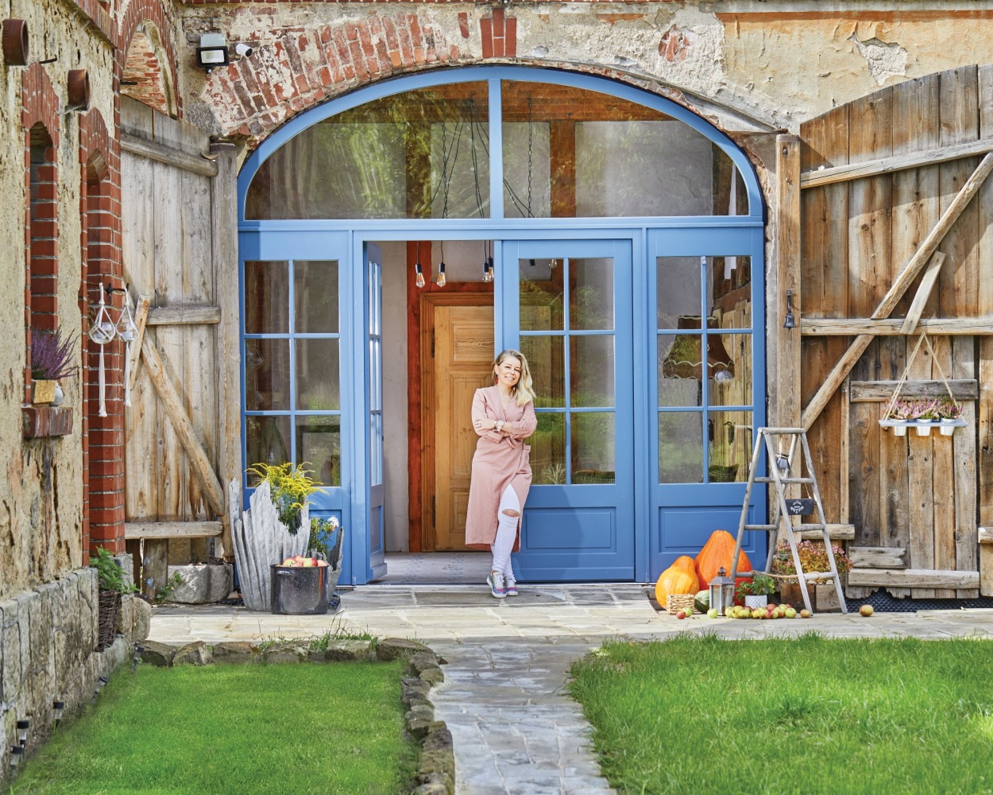 Stuletnia stodoła zamieniona w siedlisko, wokół bujna przyroda, cisza i spokój. Niegdyś do środka wjeżdżało się zaprzężonym wozem, przez potężne wrota, teraz wchodzi się przez zrobioną na zamówienie witrynę z niebieskimi framugami. Aleksandra z rodziną wróciła tu do wspomnień z dzieciństwa, a swój dom urządziła w stylu eklektycznym, łącząc design z antykami.