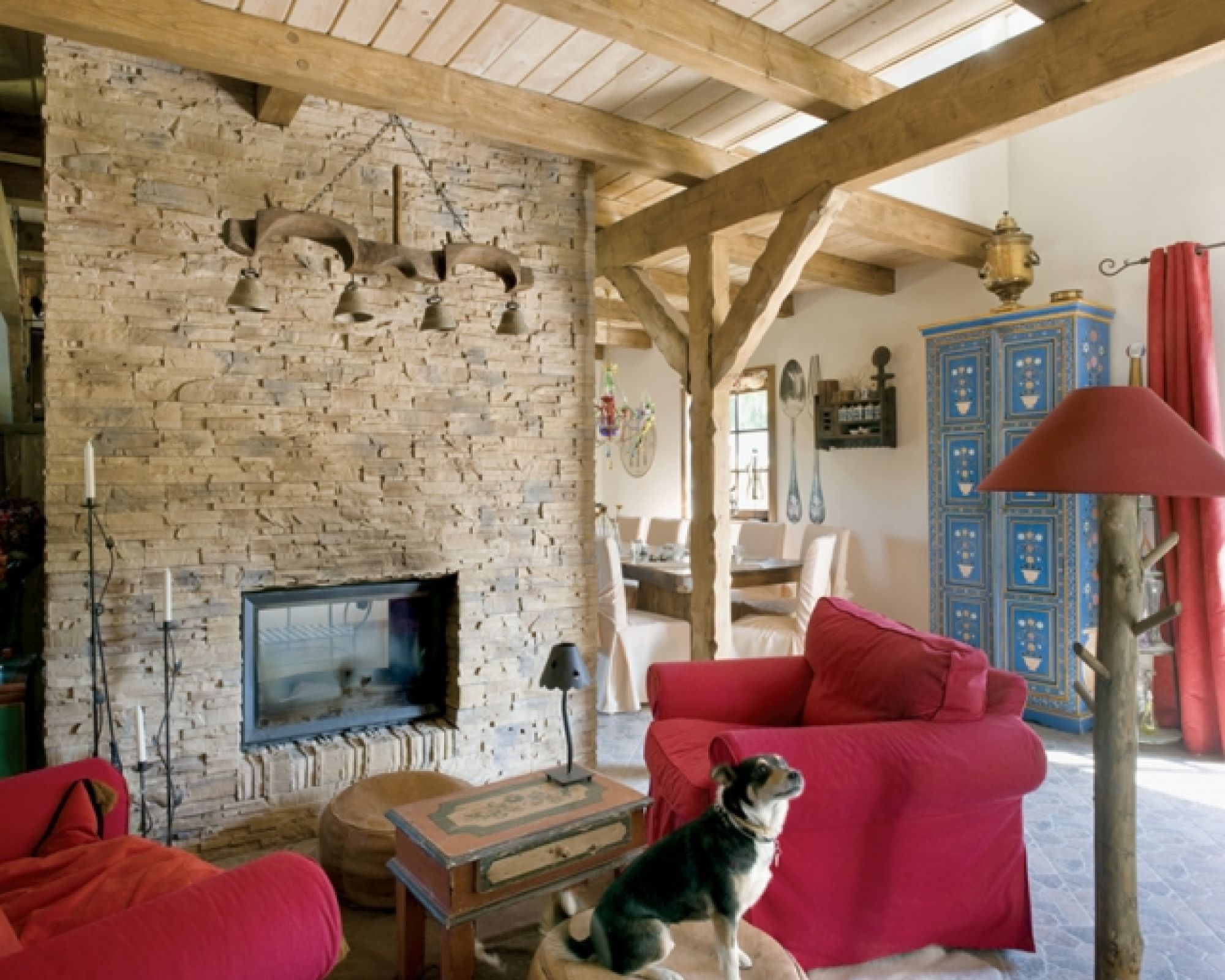 Połączenie architektury Mazowsza i klimatu domu w Alpach, czyli drewno, kamień, intensywne ciepłe barwy