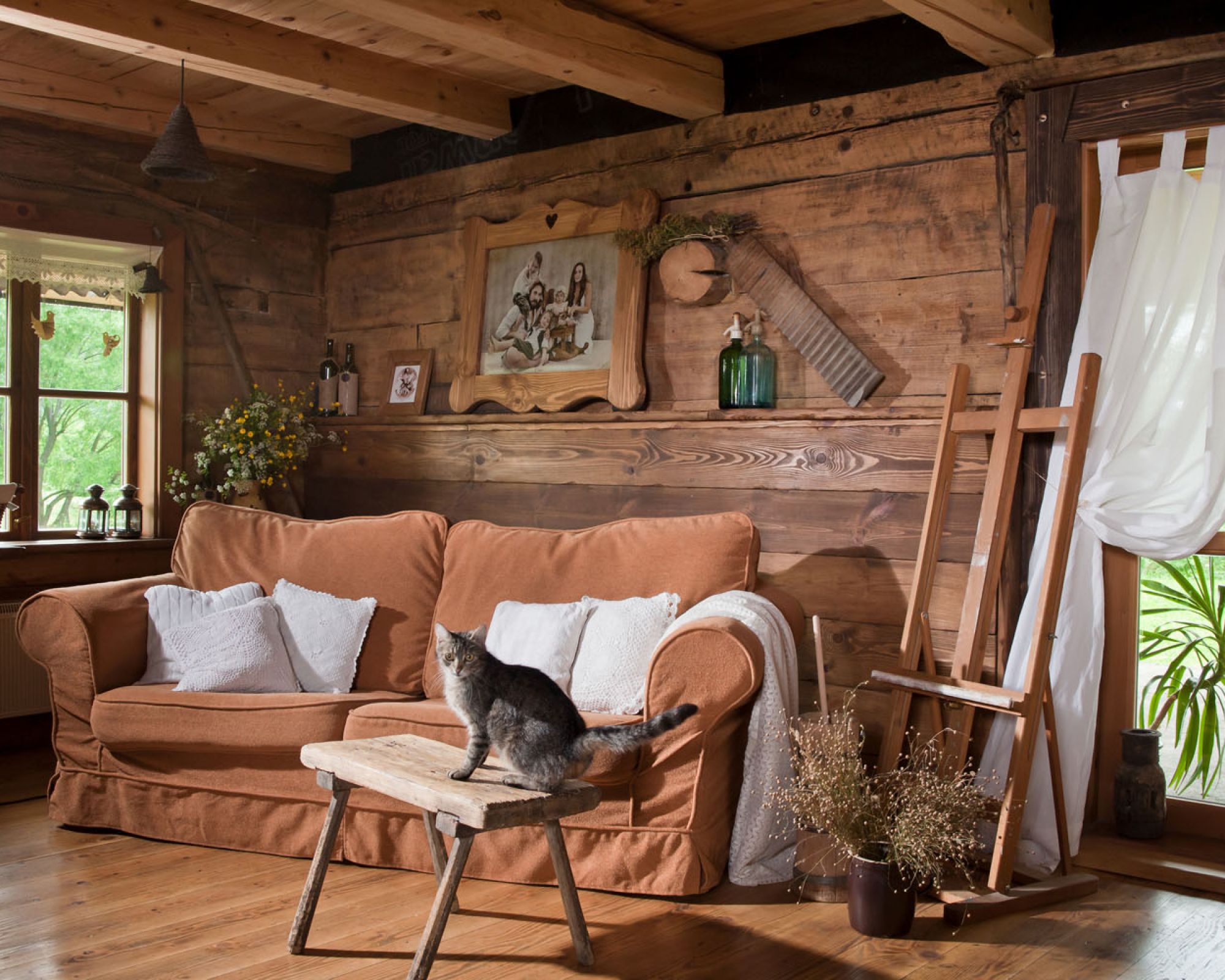 Połączenie architektury Mazowsza i klimatu domu w Alpach, czyli drewno, kamień, intensywne ciepłe barwy