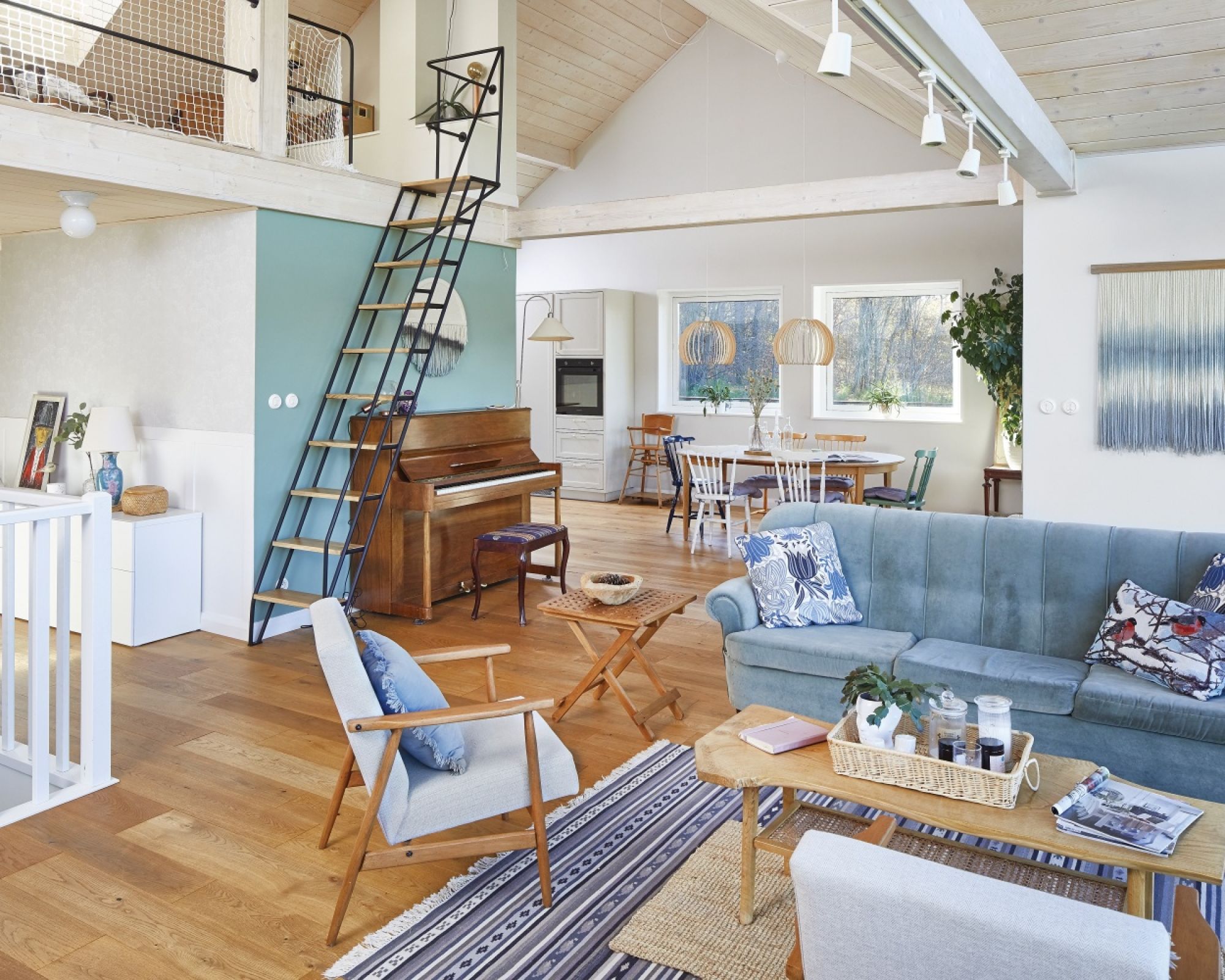 Dom w sercu puszczy: jasne wnętrza, belki na suficie i granatowe dodatki