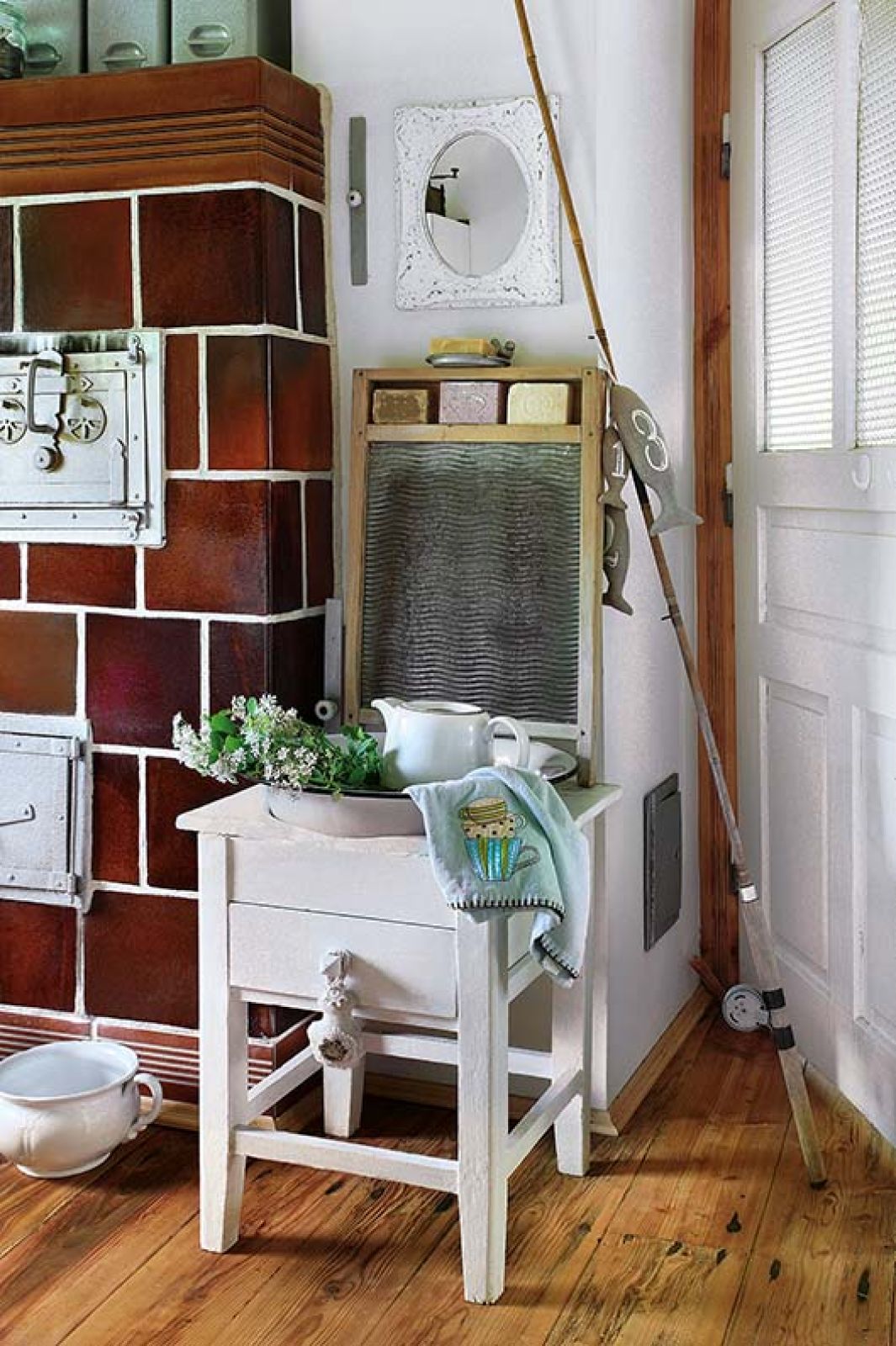 Łazienka to największe wyzwanie dla tego materiału. Dlatego powinno być jak najtrwalsze – swojski dąb albo gatunki egzotyczne – i koniecznie lite, bo warstwy rozejdą się w zaparowanym pomieszczeniu. Na koniec trzeba je zaimpregnować, najlepiej olejem. Ten zabieg warto powtarzać co jakiś czas, np. co rok. Do tego dodatki jak sprzed lat: lampy przypominające lichtarze, umywalka postawiona na starodawnej konsolce jak miednica, dawny zestaw toaletowy – dzban na wodę i miska, tara, a nawet nocnik. Polne kwiaty w oknie i można się poczuć jak u panien z Wilka.