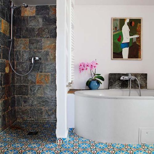Taki stołek ustawiony na kawałku skóry wygląda, jakby trafił do nas z jakiejś pierwotnej jaskini – i dobrze. Albo szklaną kabinę zastąp łupkiem na ścianie.
