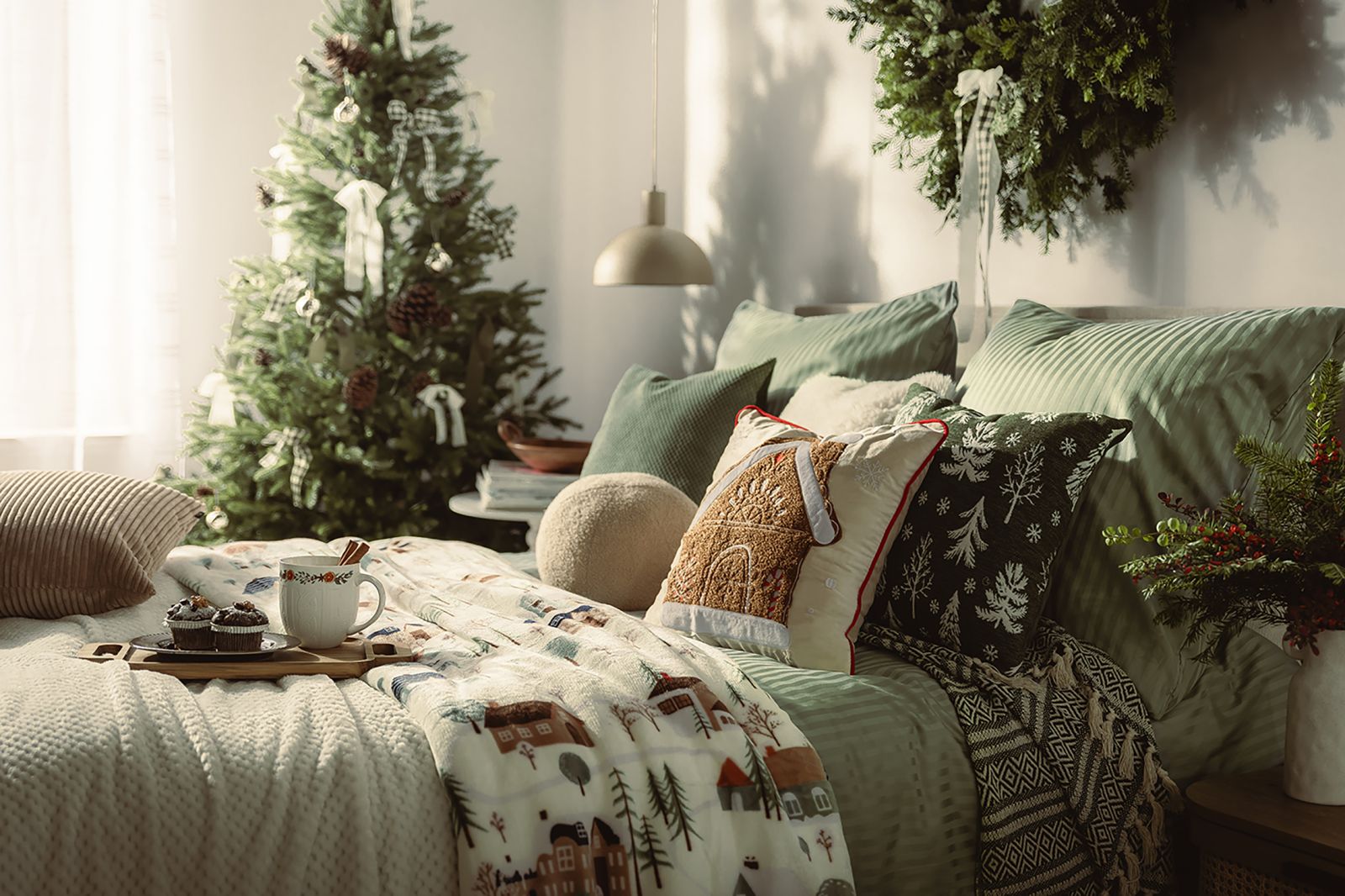 Wystarczy jeszcze kilka drobiazgów w sypialni, aby zbudować wyjątkowy klimat. Może to być zielony i czerwony świecznik, przyjemny, miękki pled w renifery, śnieżynki i wieniec zawieszony na oknie. Tyle wystarczy, aby po otworzeniu oczu od razu sobie przypomnieć, co nas za moment czeka.