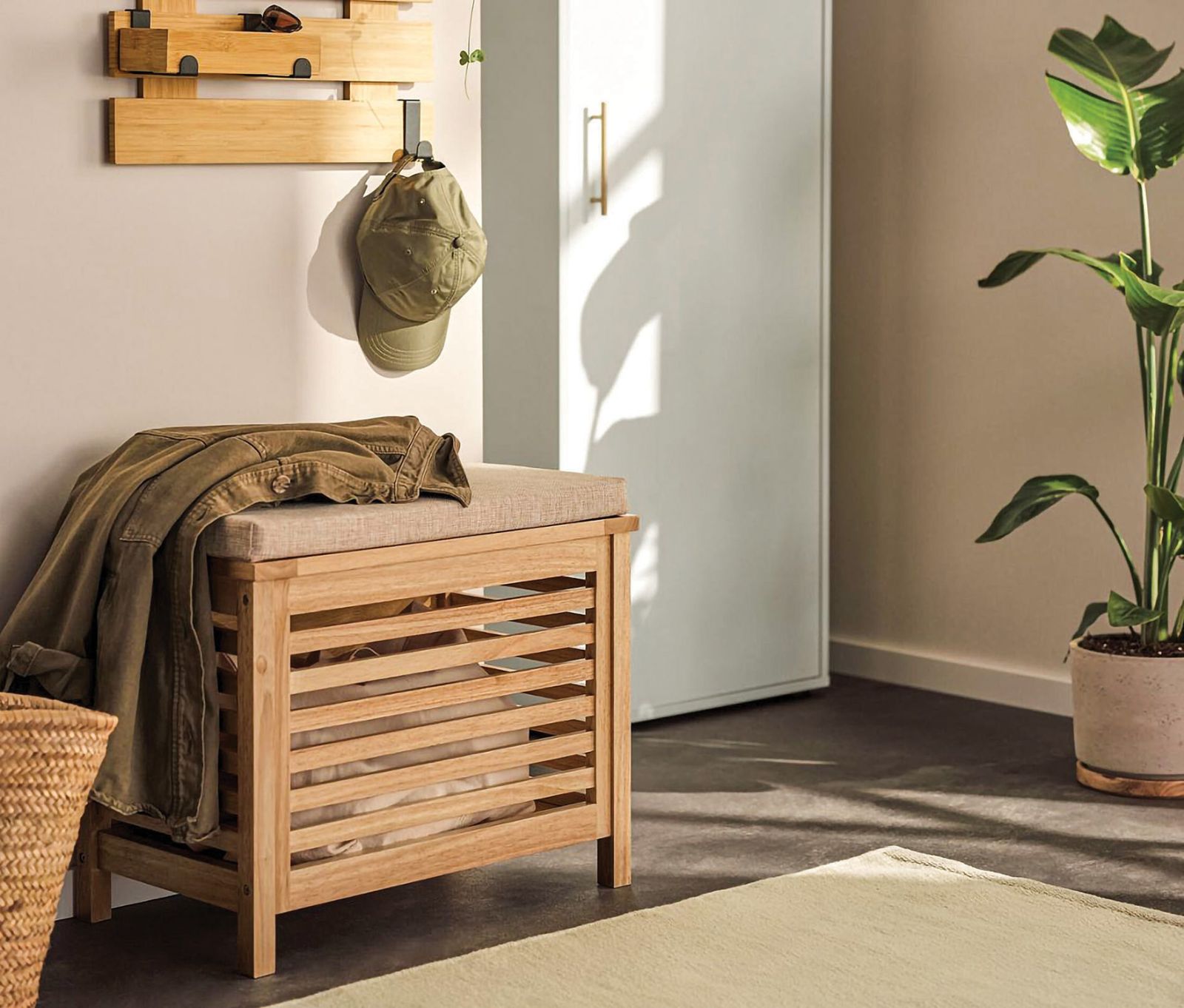 W przedpokoju świetnie wygląda drewniany kufer z siedziskiem, który jednocześnie pomoże przechowywać buty, czapki i szaliki.