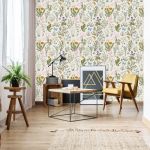• Tapeta w roślinny wzór położona na jednej ścianie za stołem