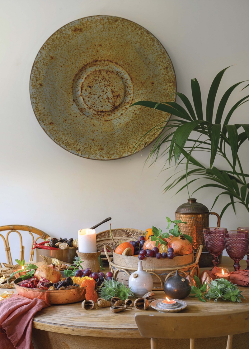Okrągła ozdoba na ścianie to znaleziona na targu staroci pokrywka, najpewniej od parownika. Belki na suficie pochodzą z rozbiórki starego domu.