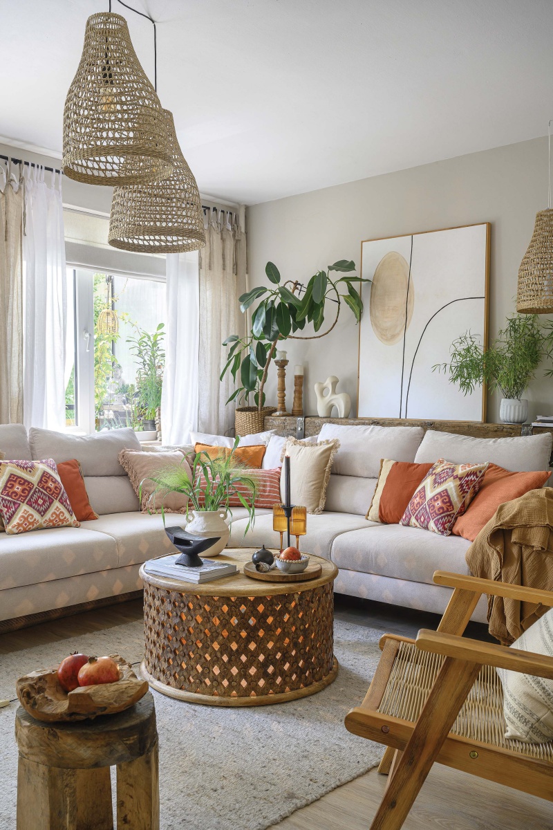 Monika miała marzenie: wiejski dom. Spełniła je, na przekór stereotypom, nie opuszczając miasta. Są tu i belki sufitowe, i meble ze starego drewna, i rozległy widok na zieleń. A jasnym i lekkim wnętrzom klimatu dodają marokańskie elementy – plecionki, tkaniny, lampiony.