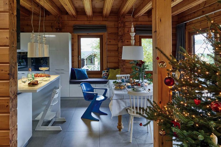 W drewnianym domu przywiezionym z Finlandii drzewko wygląda i pachnie, jakby stało u Świętego Mikołaja w Rovaniemi.