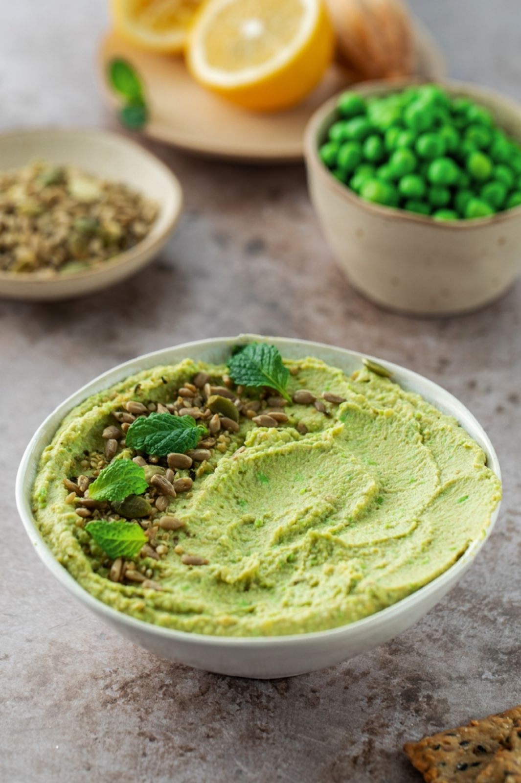Groszek zblanszuj i zblenduj z koperkiem. Wymieszaj z pokruszoną fetą, dopraw solą i pieprzem. Podawaj do wędlini marynowanych szparagów.