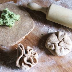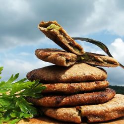 Mąkę mieszamy z solą i dodajemy tyle wody, aby wyrobić miękkie ciasto. Odstawiamy na 15 min. w misce pod przykryciem. Bób, zieloną pietruszkę, oliwki, olej i przyprawy miksujemy na gęstą pastę. Doprawiamy do smaku. Ciasto dzielimy na kulki wielkości śliwki. Rozwałkowujemy, na środku każdego układamy po łyżeczce pasty i całość składamy jak sakiewkę. Delikatnie spłaszczamy i rozwałkowujemy na placki. Placki grillujemy z dwóch str. na suchym dolnym ruszcie. Pod koniec pieczenia, placki smarujemy olejem i grillujemy jeszcze chwilę. Jeśli ciasto odstawimy na 15 min. do miseczki i przykryjemy je wilgotną ściereczką, to zrobi nam się bardziej elastyczne.