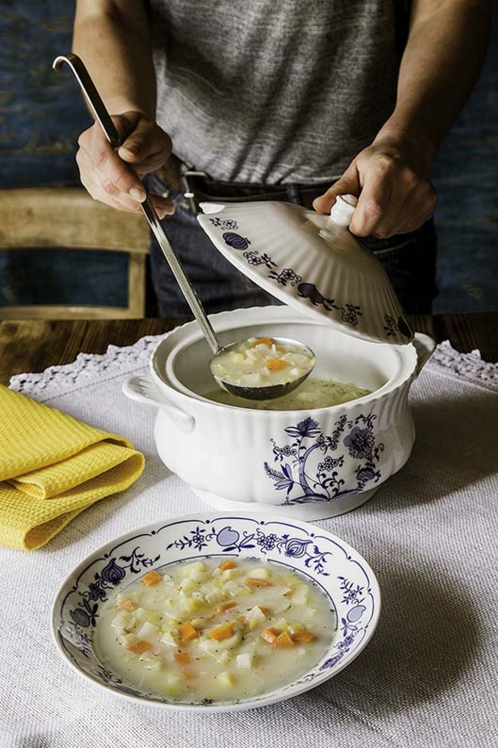 Żeby zagęścić zupę, wyjmij z niej niewielką część warzyw (mniej więcej tyle, ile zmieści się w szklance), rozgnieć na papkę i wrzuć do zupy. Posól do smaku. Cebulę pokrój w drobną kostkę i zeszklij na maśle. Zalej ją mlekiem i dodaj do zupy. Dopraw pieprzem i majerankiem. Gotuj kilka minut na małym ogniu.