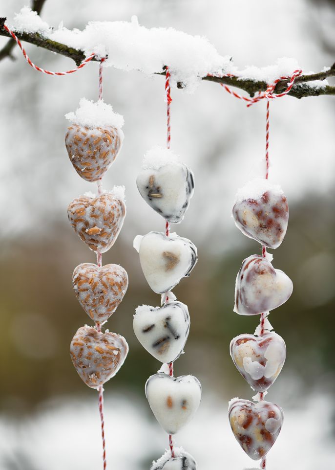 serca z tłuszczu i nasion, zawieszone na czerwonych sznurkach