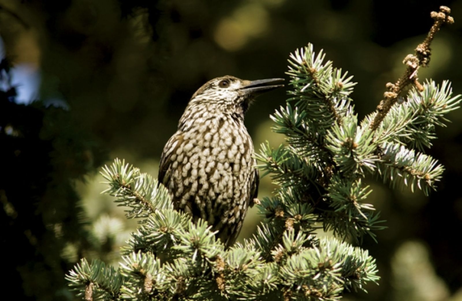 Orzechówka (Nucifraga caryocatactes). Wielkości sójki. Zasiedla bory świerkowe w górach i na północnym wschodzie kraju. Lęgi ma już na przedwiośniu. Solidne gniazdo buduje w koronie gęstego świerka. Lubi orzechy laskowe, owady i inne bezkręgowce, a także drobne kręgowce: gryzonie, pisklęta małych ptaków. Zimą nie gardzi padliną. Jesienią zdarzają się u nas naloty orzechówek ze wschodu. Różnią się od naszych większymi dziobami, nie boją się też ludzi.