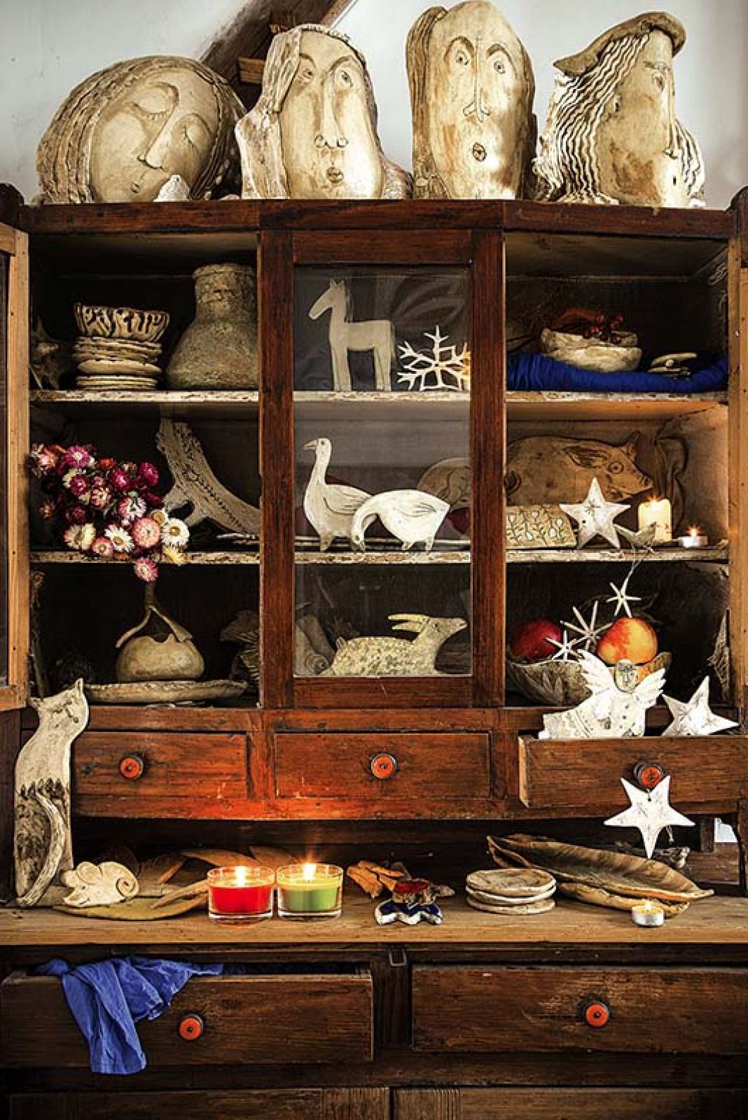 – Jestem nocnym markiem, zanim się rozkręcę, robi się już południe, więc często siedzę w pracowni wieczorami – mówi Iga. Zwykle towarzyszą jej koty. Mieszkają tu aż trzy. Szaro-biała Tosia, znaleziona przez syna, szczególnie upodobała sobie miejsce w piecu, a czarna kotka Kluska jest najbardziej towarzyska. Zdarza się, że pakuje się gościom do torebki, podczas gdy oni spoglądają na gablotę. To kredens odziedziczony po cioci Igi. Za szybą mieszkają gąski, koniki, kozy, barany, myszki, świnki, rybki, ptaszki i inne, czasami dziwne zwierzątka. Czekają, aż ktoś je przygarnie. A przygarniane są często, bo zawsze wzbudzają ciepłe uczucia. Szczególnie przed świętami, kiedy ten zwierzyniec przywodzi na myśl bożonarodzeniową szopkę.