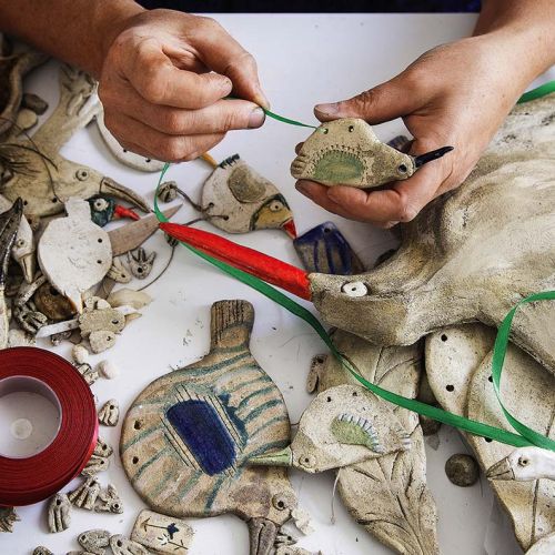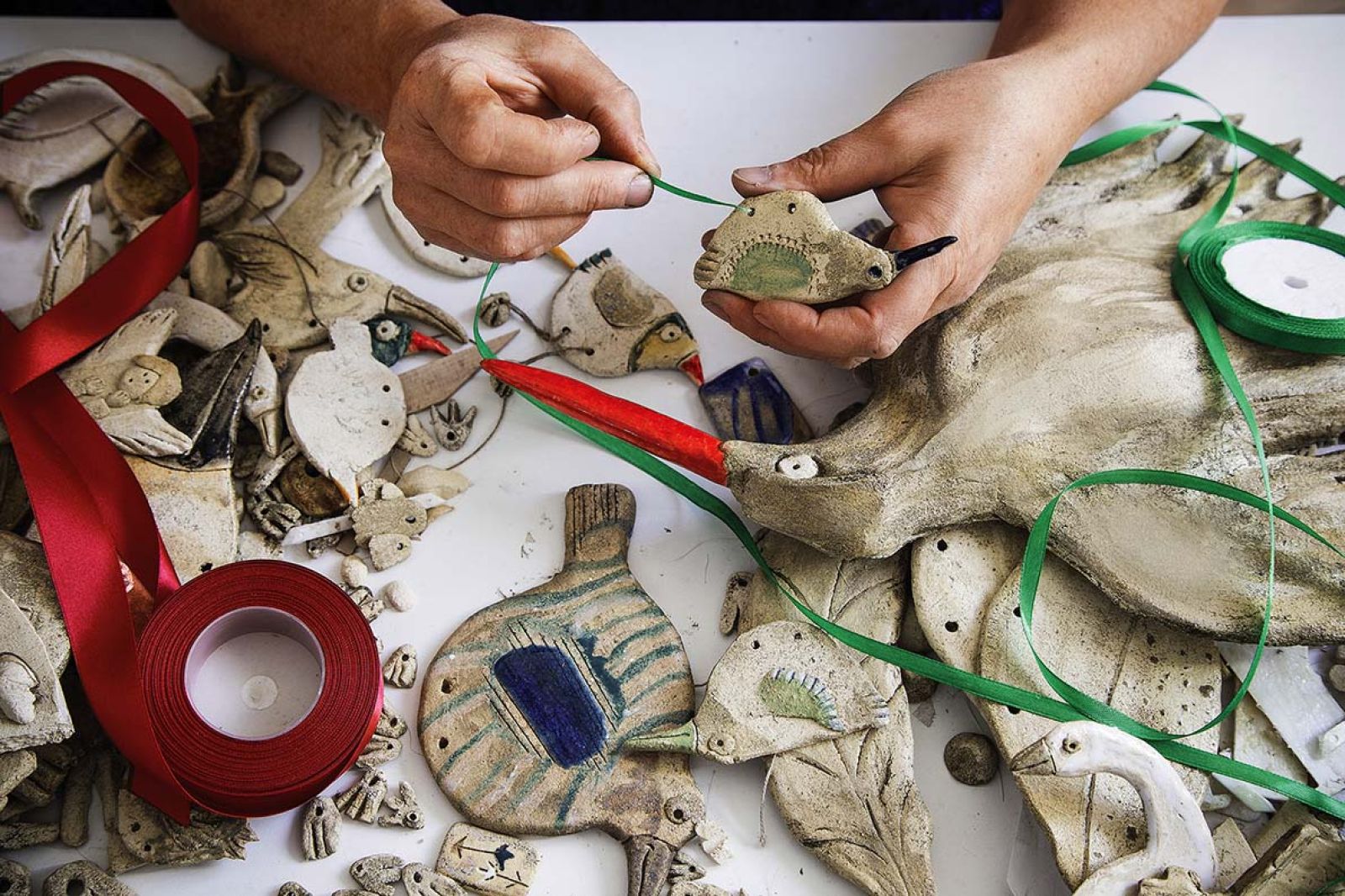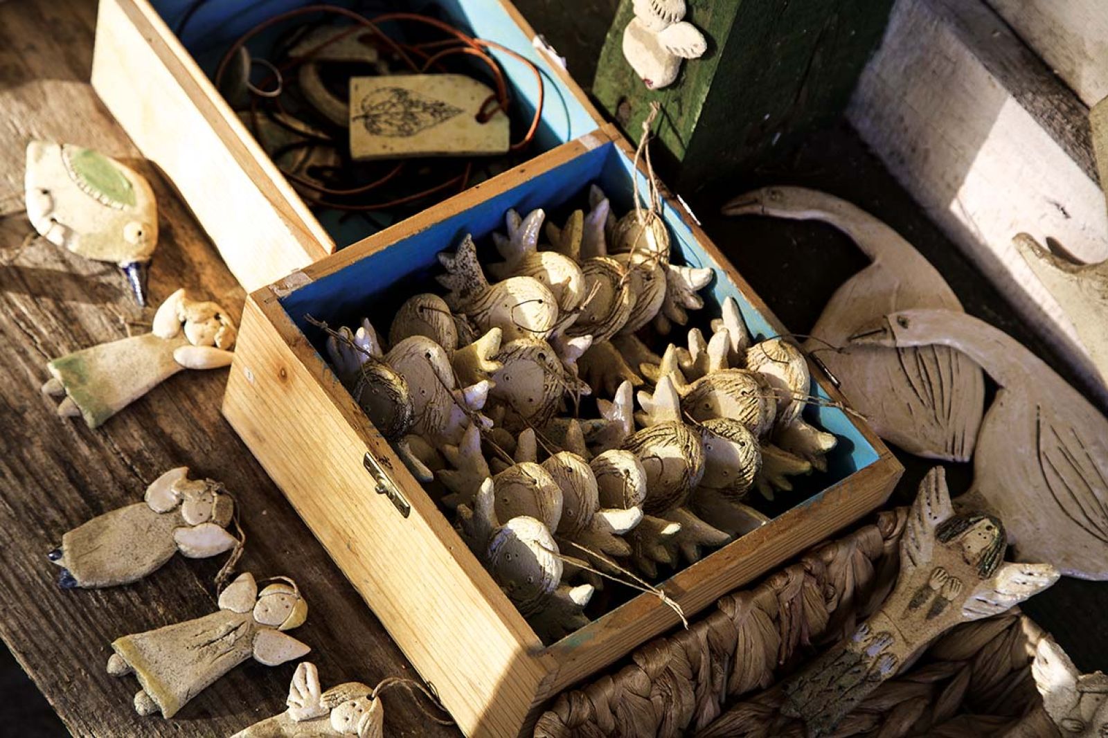 Teraz tutaj, w tym samym domu, w którym się urodziła, Iga ma pracownię. Jest też niewielka galeria, gdzie można obejrzeć jej prace: rzeźby, naczynia, biżuterię i figurki zwierząt. Ich baśniowe kształty to wynik fascynacji artystki sztuką naiwną, nieprofesjonalną, ludową. Inspiruje ją też przyroda, rzeźby są więc nieco chropowate w dotyku, w naturalnym kolorze piasku i gliny, z plamami delikatnych barw szkliwa.