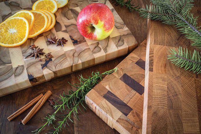 Naturalne, nieregularne krawędzie miały pierwsze deski kuchenne, jakie robił. Teraz w jego pracowni częściej powstają inne – sztorcowe, ze sklejanego drewna różnych gatunków. Dzięki temu, po pocięciu, ich powierzchnie przypominają mozaiki z wzorami w naturalnych, niezwykłych kolorach.
