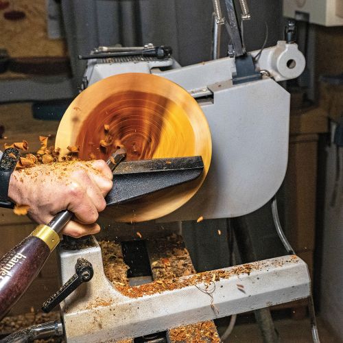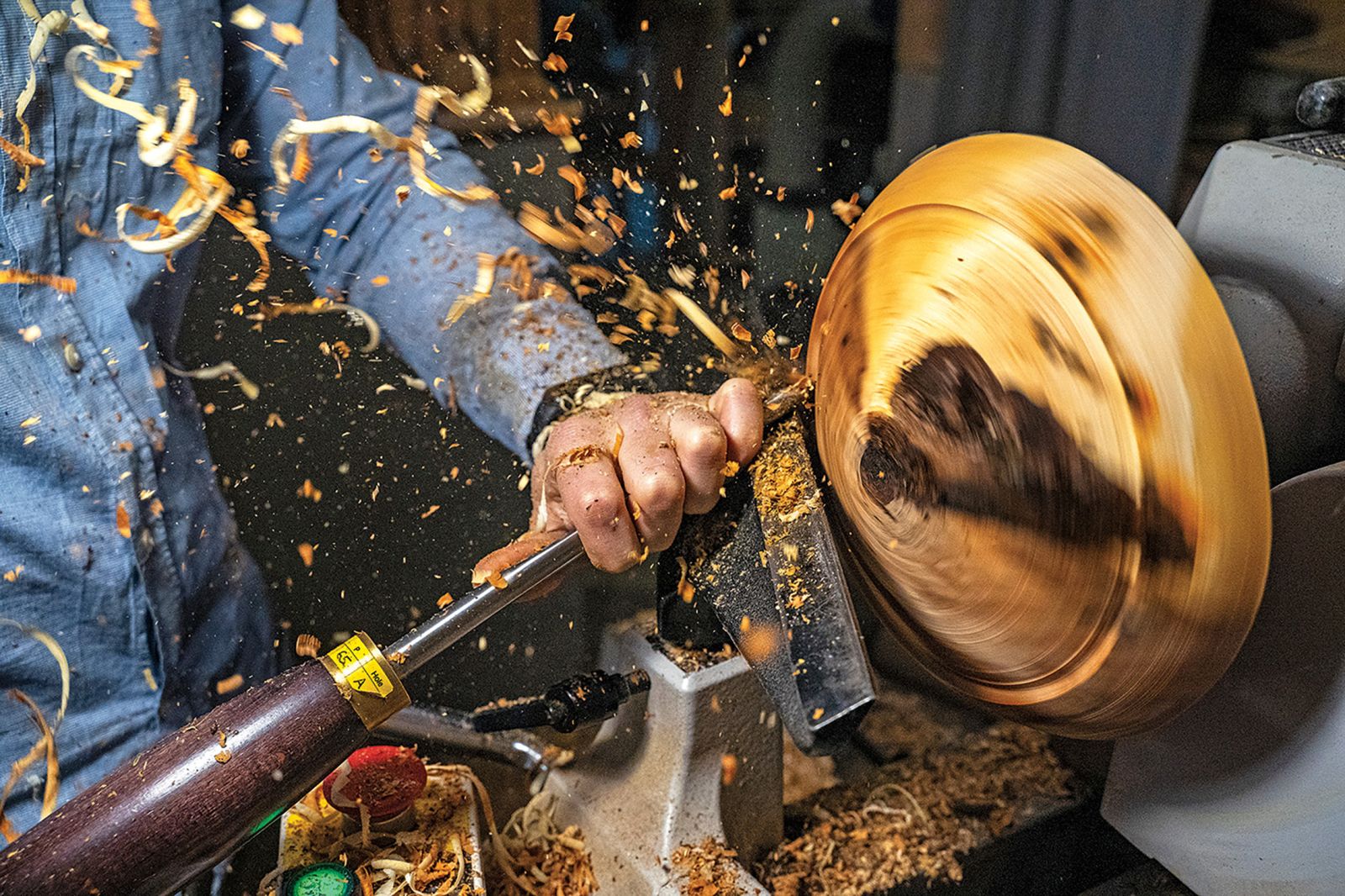 Kiedy drewno wytraci wilgoć, znowu wraca na tokarkę. Teraz można mu nadać idealną formę, zniwelować krzywizny powstałe na skutek suszenia.