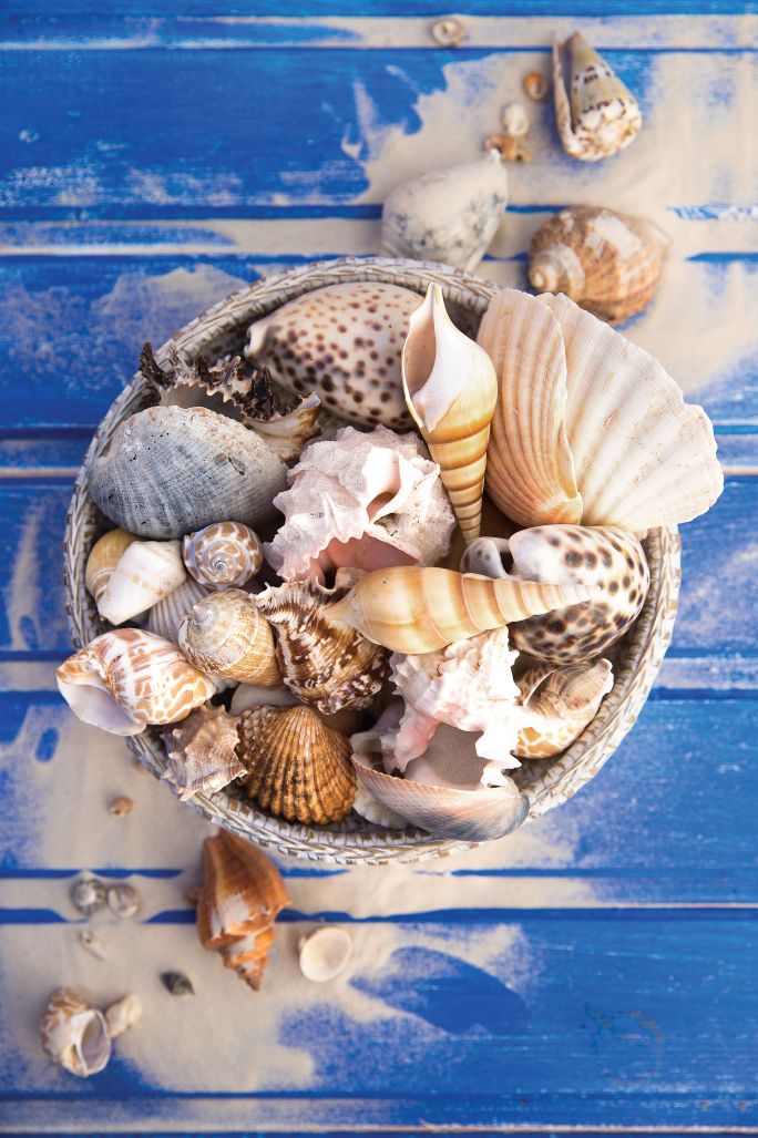 Muszle same w sobie są piękne i nie potrzebują wymyślnych aranżacji, ale ładnie pasują do pasują do ozdób w stylu boho – plecionych koszyków, podkładek pod talerze, pudełek z wikliny, sznurka, pędów hiacynta, traw. Dobieraj kolory takie, jakie spotkasz w ich naturalnym środowisku na plaży: błękit (jak niebo i woda), spłowiałe beże i brązy (jak kawałki drewna wyszorowane przez morską wodę i wypalone przez słońce), biel i piaskowy (jak piasek na plaży).