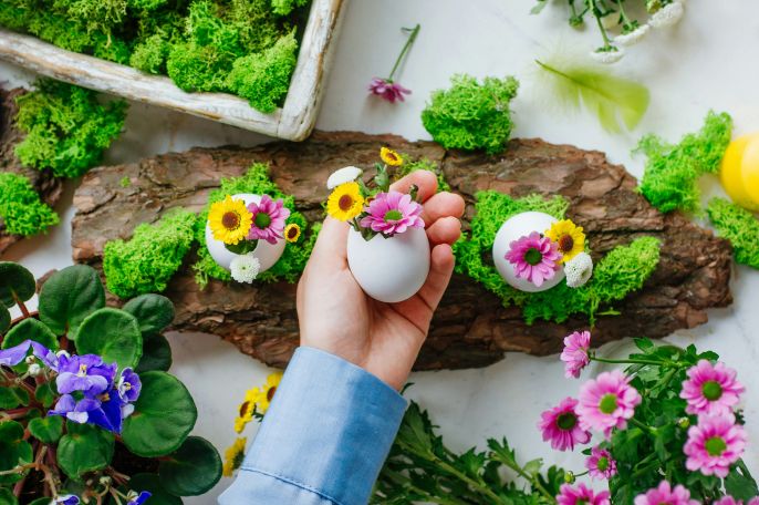 Kilka jajek, trochę farby, kwiaty z ogrodu albo karton po jajkach - tyle wystarczy, żeby stworzyć piękne dekoracje wielkanocne DIY.