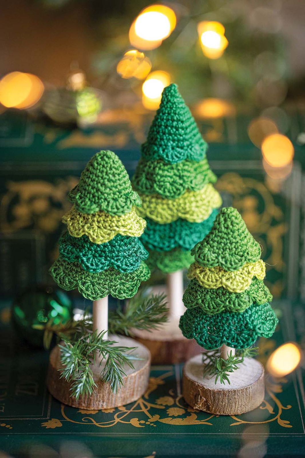 To propozycja dla tych, którzy lubią rytm szydełka. Z trzech odcieni zielonego kordonka można stworzyć małe „piętrowe” świerki, które wyglądają jak bajkowe miniatury.