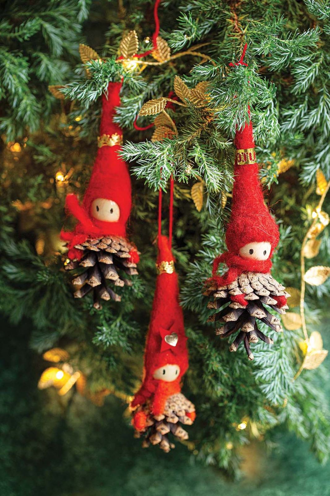 Wystarczy kilka dorodnych szyszek, trochę czerwonej włóczki i filcu, aby stworzyć zawieszki w kształcie zimowych skrzatów.