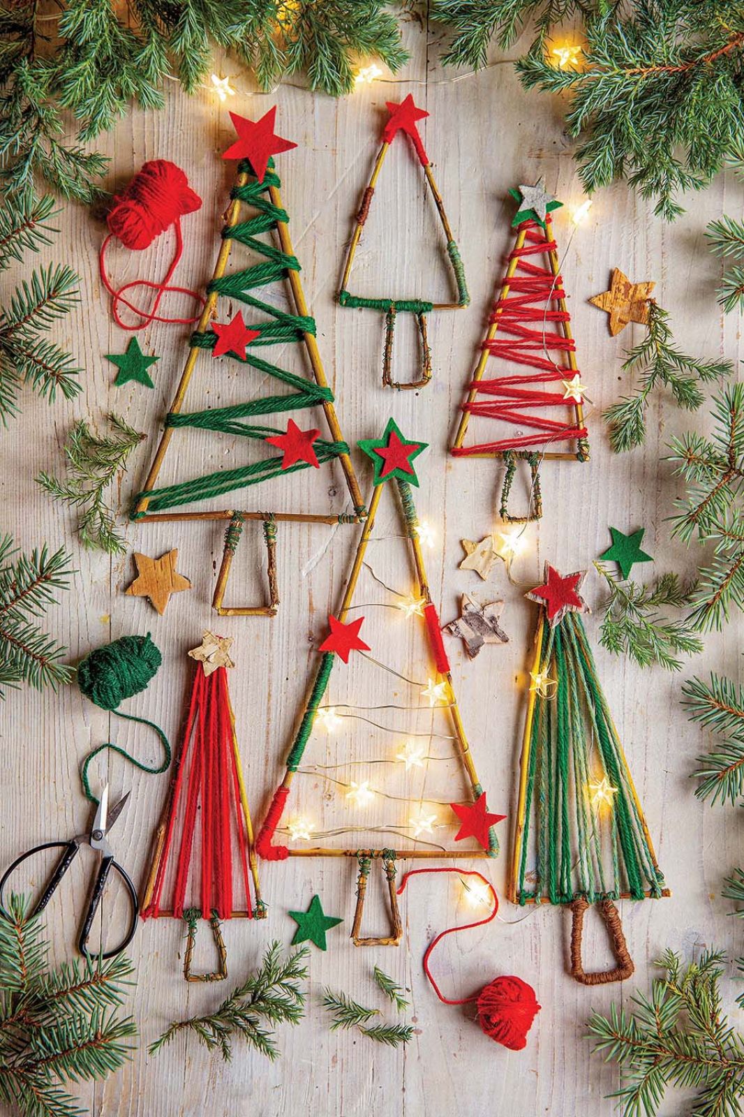Naturalne witki wierzby lub brzozy można delikatnie nadłamać i uformować w trójkąt — szkic domowej choinki.