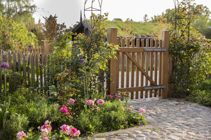 Drewniane furtki, pergole, łuki i płotki często porośnięte są pnączami – to róże, powojniki czy winorośle, które zacierają ostre linie konstrukcji.