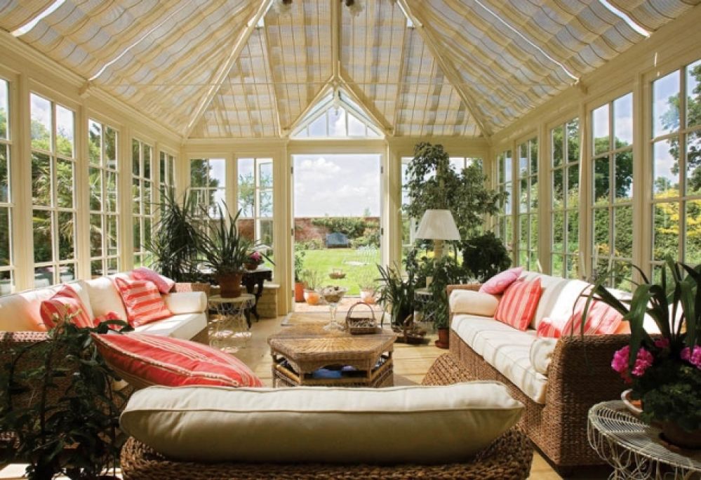 Maty zacieniające salon w oranżerii można podnosić lub opuszczać dzięki pilotowi. Vale Garden