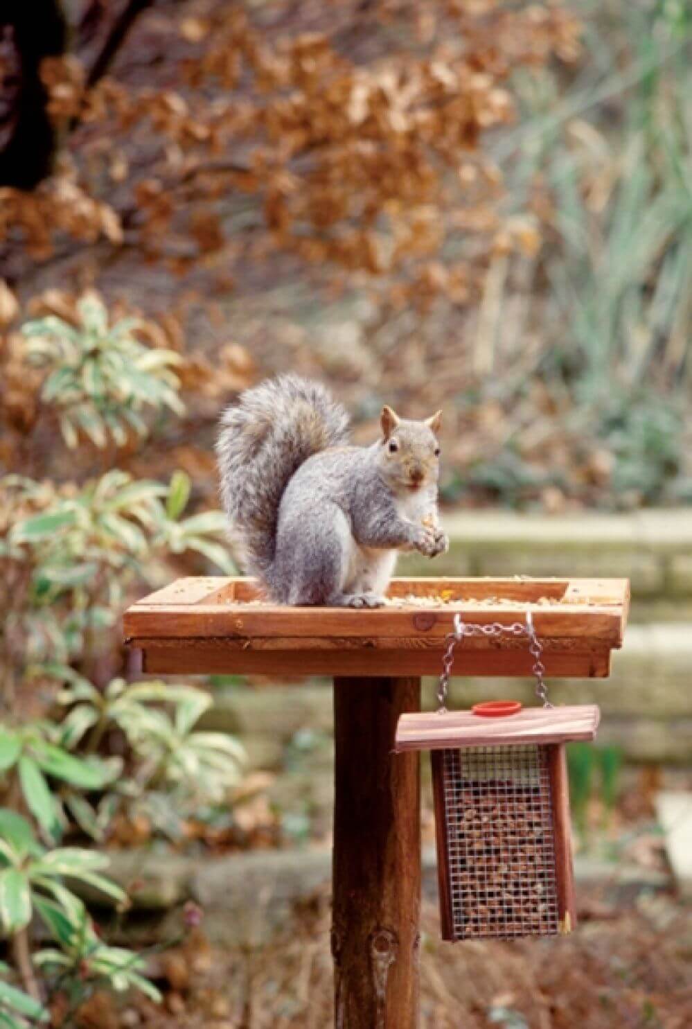 Wiewiórki, choć na zimę potrafią zebrać spore zapasy i poutykać je w rozmaitych zakamarkach, wiecznie są głodne. Niestety zapominają, gdzie urządziły swoje spiżarnie i… napadają na ptasie budki. Nie dość, że wszystko wyjadają, to jeszcze płoszą skrzydlatych śpiewaków. Aby wilk był syty i owca cała, warto więc zawczasu wybudować dwie jadłodajnie i przymocować je na drążku jedna pod drugą.