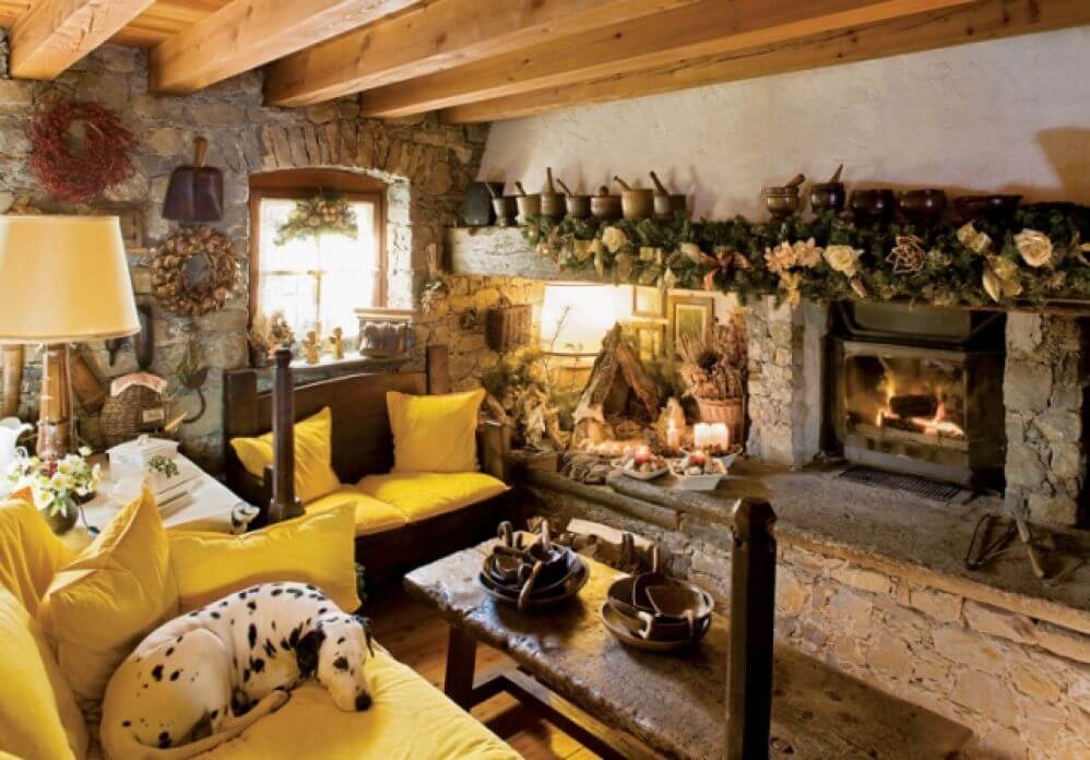 W stare kamienne palenisko wmontowano współczesny wkład kominkowy.