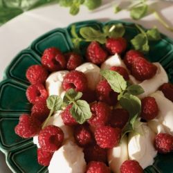 Serek wyłóż na talerzyki. Posyp malinami i udekoruj podartą na kawałki miętą. Mascarpone można zastąpić wiejskim serkiem zmieszanym z łyżeczką miodu.